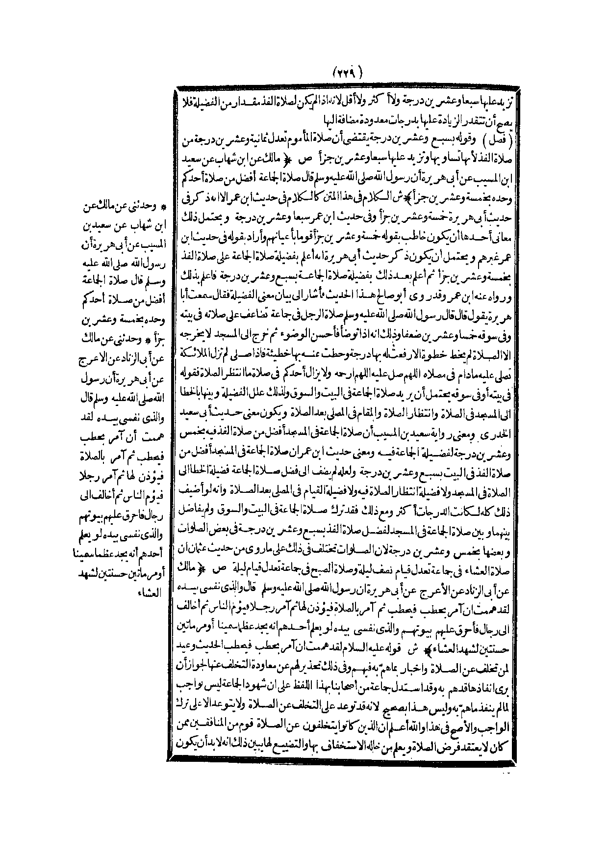 (ص) : (مَالِكٌ عَنْ ابْنِ شِهَابٍ عَنْ سَعِيدِ بْنِ الْمُسَيِّبِ عَنْ أَبِي هُرَيْرَةَ أَنَّ رَسُولَ اللَّهِ - صَلَّى اللَّهُ عَلَيْهِ وَسَلَّمَ - قَالَ «صَلَاةُ الْجَمَاعَةِ أَفْضَلُ مِنْ صَلَاةِ أَحَدِكُمْ وَحْدَهُ بِخَمْسَةٍ وَعِشْرِينَ جُزْءًا»