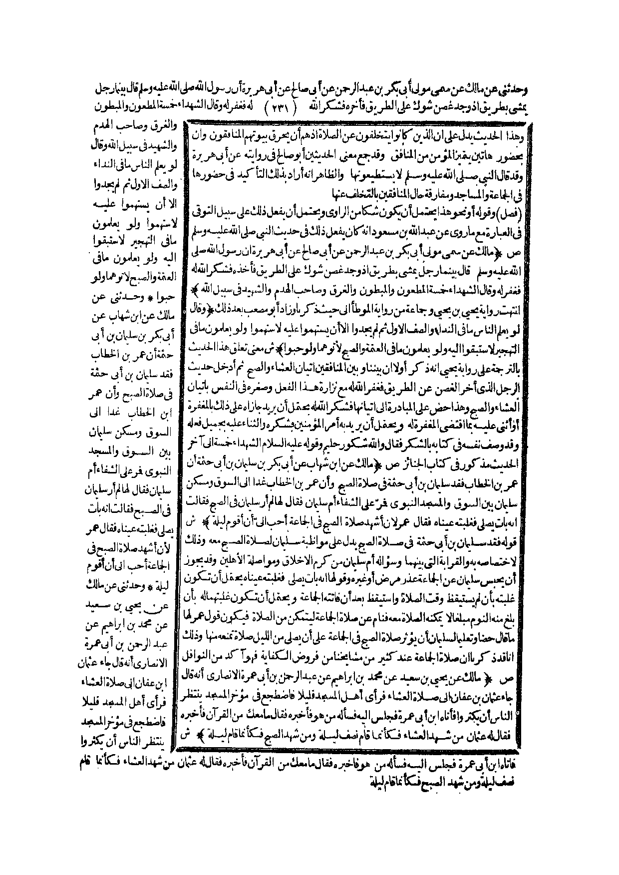 (ص) : (مَالِكٌ عَنْ يَحْيَى بْنِ سَعِيدٍ عَنْ مُحَمَّدِ بْنِ إبْرَاهِيمَ عَنْ عَبْدِ الرَّحْمَنِ بْنِ أَبِي عَمْرَةَ الْأَنْصَارِيِّ أَنَّهُ قَالَ جَاءَ عُثْمَانُ بْنُ عَفَّانَ إلَى صَلَاةِ الْعِشَاءِ فَرَأَى أَهْلَ الْمَسْجِدِ قَلِيلًا فَاضْطَجَعَ فِي مُؤَخِّرِ الْمَسْجِدِ يَنْتَظِرُ النَّاسَ أَنْ يَكْثُرُوا فَأَتَاهُ ابْنُ أَبِي عَمْرَةَ فَجَلَسَ إلَيْهِ فَسَأَلَهُ مَنْ هُوَ فَأَخْبَرَهُ فَقَالَ مَا مَعَكَ مِنْ الْقُرْآنِ فَأَخْبَرَهُ فَقَالَ لَهُ عُثْمَانُ مَنْ شَهِدَ الْعِشَاءَ فَكَأَنَّمَا قَامَ نِصْفَ لَيْلَةٍ وَمَنْ شَهِدَ الصُّبْحَ فَكَأَنَّمَا قَامَ لَيْلَةً) .