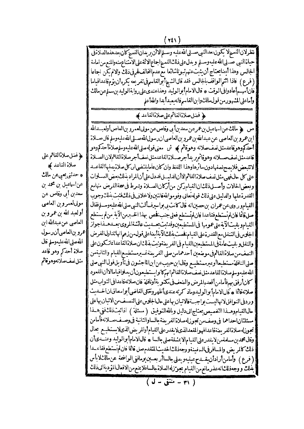 فَضْلُ صَلَاةِ الْقَائِمِ عَلَى صَلَاةِ الْقَاعِدِ (ص) : (مَالِكٌ عَنْ إسْمَاعِيلِ بْنِ عُمَرَ عَنْ سَعْدِ بْنِ أَبِي وَقَّاصٍ عَنْ مَوْلًى لِعَمْرِو بْنِ الْعَاصِ أَوْ لِعَبْدِ اللَّهِ بْنِ عَمْرِو بْنِ الْعَاصِي عَنْ عَبْدِ اللَّهِ بْنِ عَمْرِو بْنِ الْعَاصِ أَنَّ رَسُولَ اللَّهِ - صَلَّى اللَّهُ عَلَيْهِ وَسَلَّمَ - قَالَ «صَلَاةُ أَحَدِكُمْ وَهُوَ قَاعِدٌ مِثْلُ نِصْفِ صَلَاتِهِ وَهُوَ قَائِمٌ» )