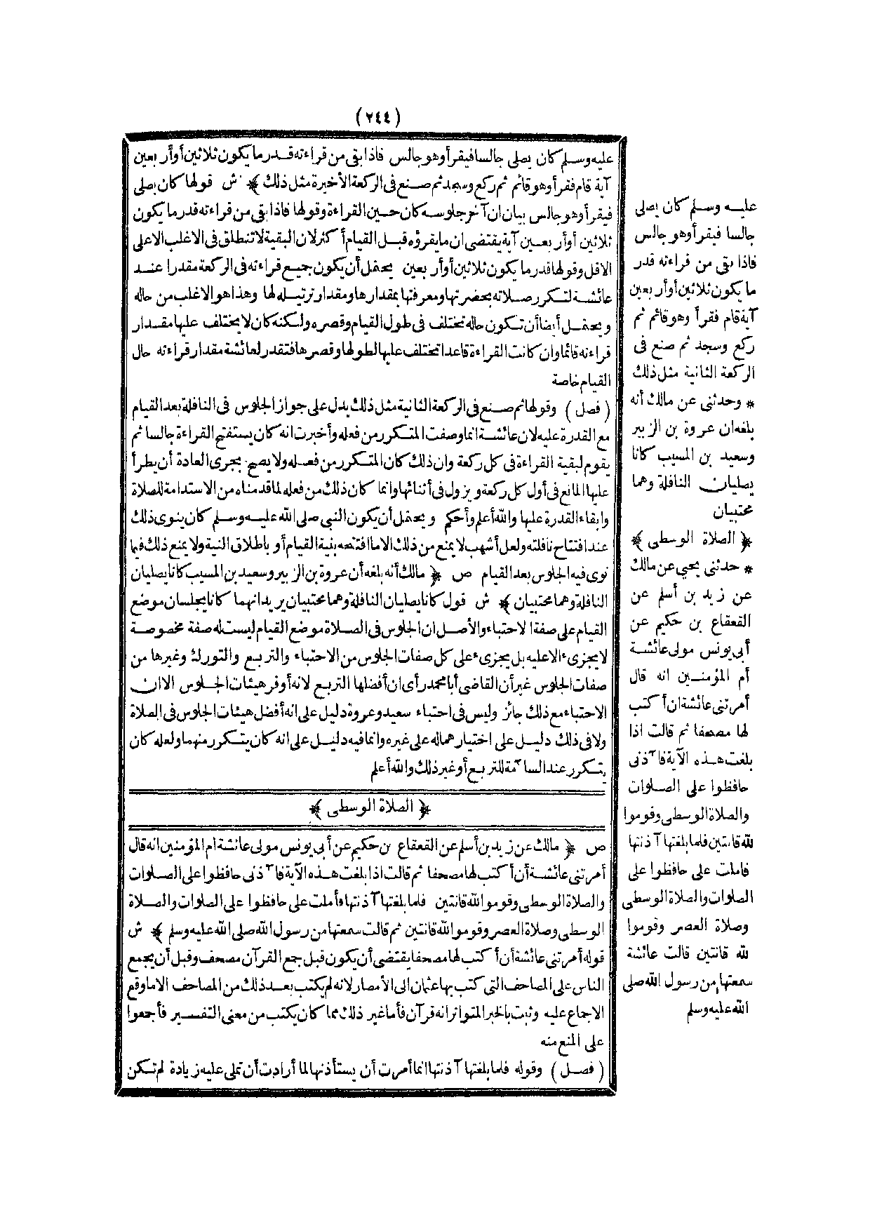 الصَّلَاةُ الْوُسْطَى (ص) : (مَالِكٌ عَنْ زَيْدِ بْنِ أَسْلَمَ عَنْ الْقَعْقَاعِ بْنِ حَكِيمٍ عَنْ أَبِي يُونُسَ مَوْلَى عَائِشَةَ أُمِّ الْمُؤْمِنِينَ أَنَّهُ قَالَ أَمَرَتْنِي عَائِشَةُ أَنْ أَكْتُبَ لَهَا مُصْحَفًا ثُمَّ قَالَتْ إذَا بَلَغْتُ هَذِهِ الْآيَةَ فَآذَنِّي {حَافِظُوا عَلَى الصَّلَوَاتِ وَالصَّلاةِ الْوُسْطَى وَقُومُوا لِلَّهِ قَانِتِينَ} [البقرة: 238] فَلَمَّا بَلَغْتُهَا آذَنْتُهَا فَأَمْلَتْ عَلَيَّ «حَافِظُوا عَلَى الصَّلَوَاتِ وَالصَّلَاةِ الْوُسْطَى وَصَلَاةِ الْعَصْرِ وَقُومُوا لِلَّهِ قَانِتِينَ» ثُمَّ قَالَتْ سَمِعْتهَا مِنْ رَسُولِ اللَّهِ - صَلَّى اللَّهُ عَلَيْهِ وَسَلَّمَ -) .