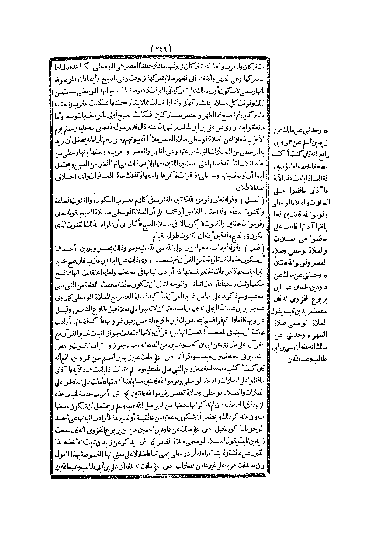 (ص) : (مَالِكٌ عَنْ زَيْدِ بْنِ أَسْلَمَ عَنْ عَمْرِو بْنِ رَافِعٍ أَنَّهُ قَالَ كُنْت أَكْتُبُ مُصْحَفًا لِحَفْصَةَ زَوْجِ النَّبِيِّ - صَلَّى اللَّهُ عَلَيْهِ وَسَلَّمَ - فَقَالَتْ إذَا بَلَغْت هَذِهِ الْآيَةَ فَآذَنِّي {حَافِظُوا عَلَى الصَّلَوَاتِ وَالصَّلاةِ الْوُسْطَى وَقُومُوا لِلَّهِ قَانِتِينَ} [البقرة: 238] فَلَمَّا بَلَغْتهَا آذَنْتهَا فَأَمْلَتْ عَلَيَّ حَافِظُوا عَلَى الصَّلَوَاتِ وَالصَّلَاةِ الْوُسْطَى وَصَلَاةِ الْعَصْرِ وَقُومُوا لِلَّهِ قَانِتِينَ) .