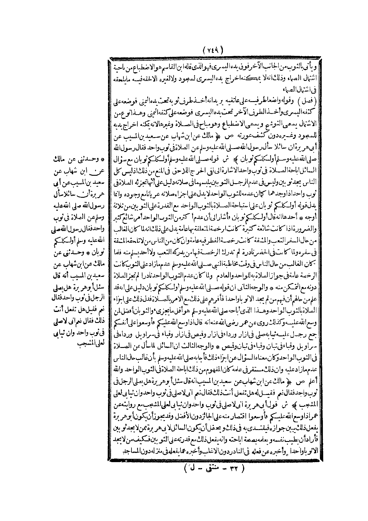(ص) : (مَالِكٌ عَنْ ابْنِ شِهَابٍ عَنْ سَعِيدِ بْنِ الْمُسَيِّبِ عَنْ أَبِي هُرَيْرَةَ «أَنَّ سَائِلًا سَأَلَ رَسُولَ اللَّهِ - صَلَّى اللَّهُ عَلَيْهِ وَسَلَّمَ - عَنْ الصَّلَاةِ فِي ثَوْبٍ وَاحِدٍ فَقَالَ رَسُولُ اللَّهِ - صَلَّى اللَّهُ عَلَيْهِ وَسَلَّمَ - أَوَلِكُلِّكُمْ ثَوْبَانِ» )