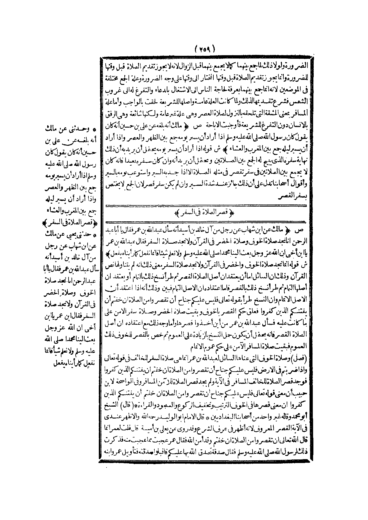 قَصْرُ الصَّلَاةِ فِي السَّفَرِ (ص) : (مَالِكٌ عَنْ ابْنِ شِهَابٍ «عَنْ رَجُلٍ مِنْ آلِ خَالِدِ بْنِ أَسِيدٍ أَنَّهُ سَأَلَ عَبْدَ اللَّهِ بْنَ عُمَرَ فَقَالَ يَا أَبَا عَبْدِ الرَّحْمَنِ إنَّا نَجِدُ صَلَاةَ الْخَوْفِ وَصَلَاةَ الْحَضَرِ فِي الْقُرْآنِ وَلَا نَجِدُ صَلَاةَ السَّفَرِ فَقَالَ عَبْدُ اللَّهِ بْنُ عُمَرَ يَا ابْنَ أَخِي إنَّ اللَّهَ عَزَّ وَجَلَّ بَعَثَ إلَيْنَا مُحَمَّدًا - صَلَّى اللَّهُ عَلَيْهِ وَسَلَّمَ - وَلَا نَعْلَمُ شَيْئًا فَإِنَّمَا نَفْعَلُ كَمَا رَأَيْنَاهُ يَفْعَلُ» )
