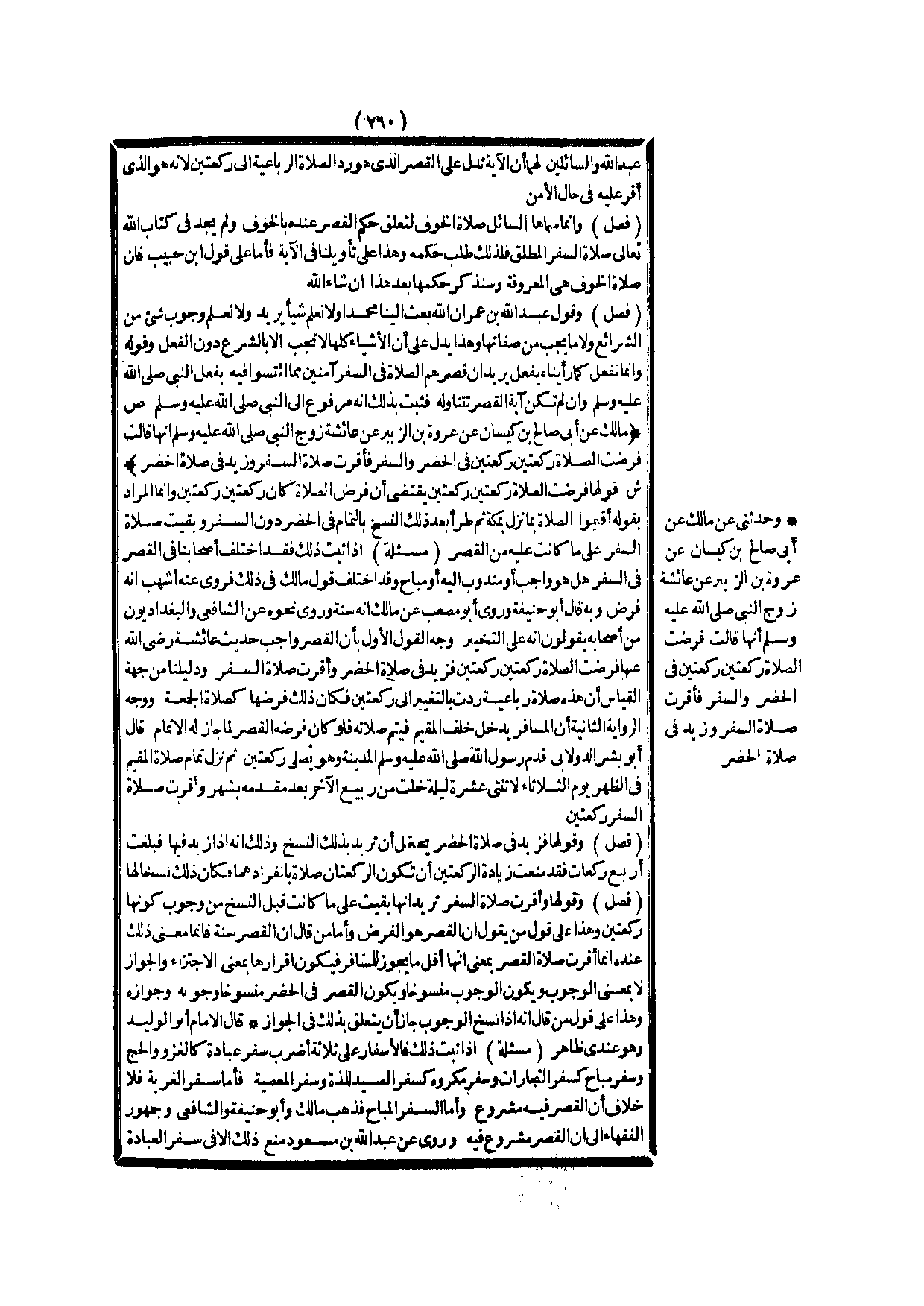 (ش) : قَوْلُهَا فُرِضَتْ الصَّلَاةُ رَكْعَتَيْنِ رَكْعَتَيْنِ يَقْتَضِي أَنَّ فَرْضَ الصَّلَاةِ كَانَ رَكْعَتَيْنِ رَكْعَتَيْنِ وَإِنَّمَا الْمُرَادُ بِقَوْلِهِ أَقِيمُوا الصَّلَاةَ بِمَا نَزَلَ بِمَكَّةَ ثُمَّ طَرَأَ بَعْدَ ذَلِكَ النَّسْخُ بِالتَّمَامِ فِي الْحَضَرِ دُونَ السَّفَرِ وَبَقِيَتْ صَلَاةُ السَّفَرِ عَلَى مَا كَانَتْ عَلَيْهِ مِنْ الْقَصْرِ.