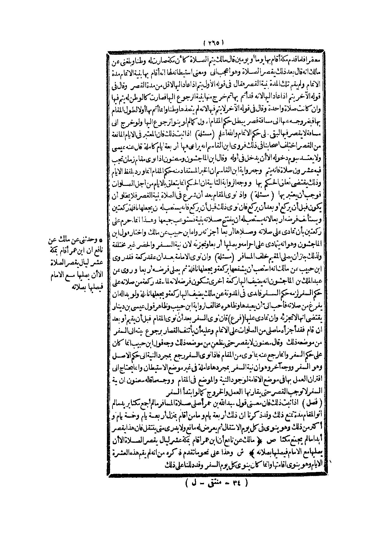 (ص) : (مَالِكٌ عَنْ نَافِعٍ أَنَّ ابْنَ عُمَرَ أَقَامَ بِمَكَّةَ عَشْرَ لَيَالٍ يَقْصُرُ الصَّلَاةَ إلَّا أَنْ يُصَلِّيَهَا مَعَ الْإِمَامِ فَيُصَلِّيَهَا بِصَلَاتِهِ) .