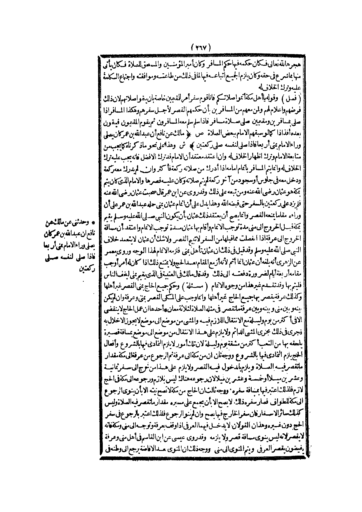 (ص) : (مَالِكٌ عَنْ نَافِعٍ أَنَّ عَبْدَ اللَّهِ بْنَ عُمَرَ كَانَ يُصَلِّي وَرَاءَ الْإِمَامِ بِمِنًى أَرْبَعًا فَإِذَا صَلَّى لِنَفْسِهِ صَلَّى رَكْعَتَيْنِ)