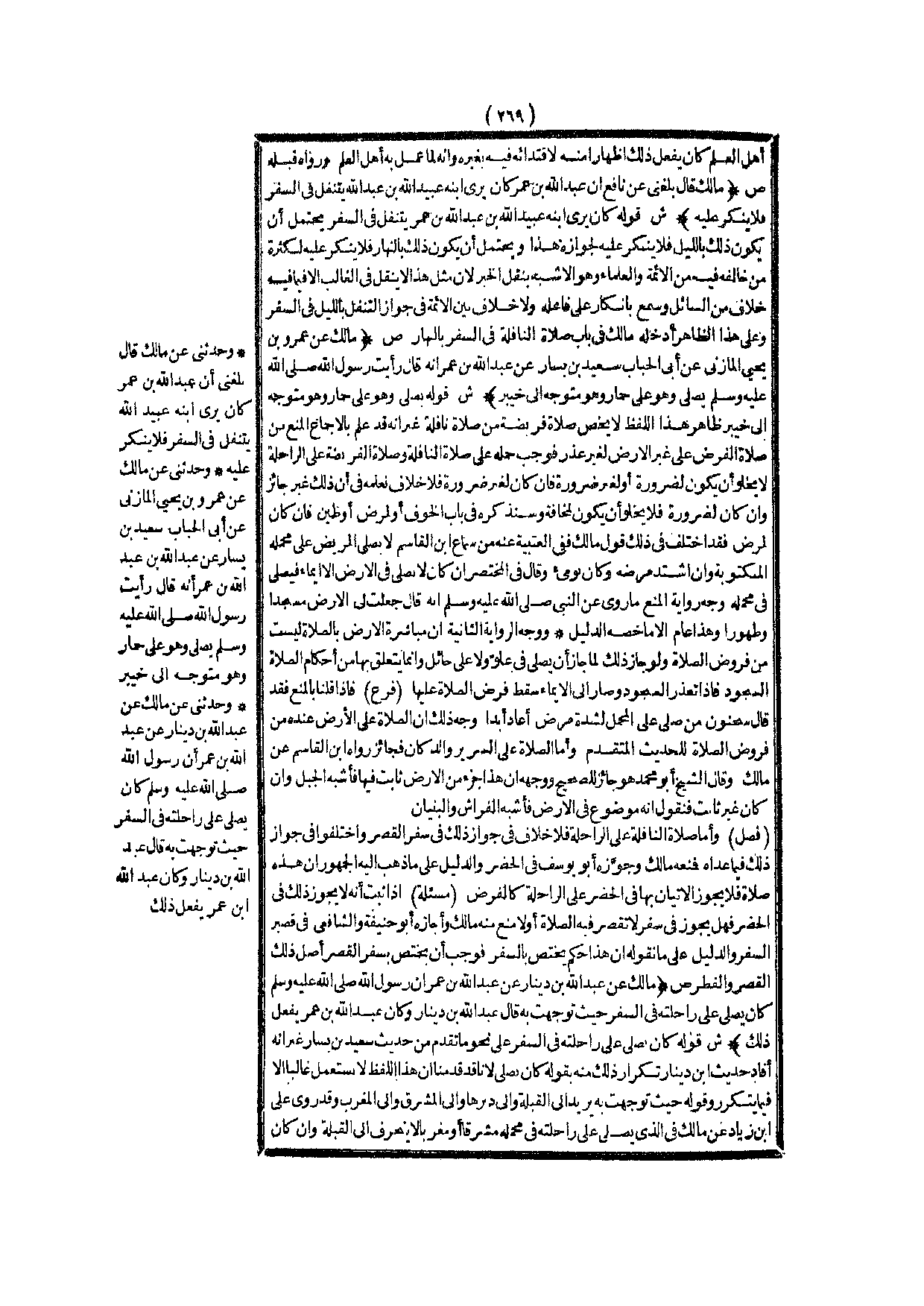 (ص) : (مَالِكٌ قَالَ بَلَغَنِي عَنْ نَافِعٍ أَنَّ عَبْدَ اللَّهِ بْنَ عُمَرَ كَانَ يَرَى ابْنَهُ عُبَيْدَ اللَّهِ بْنِ عَبْدِ اللَّهِ يَتَنَفَّلُ فِي السَّفَرِ فَلَا يُنْكِرُ عَلَيْهِ) .