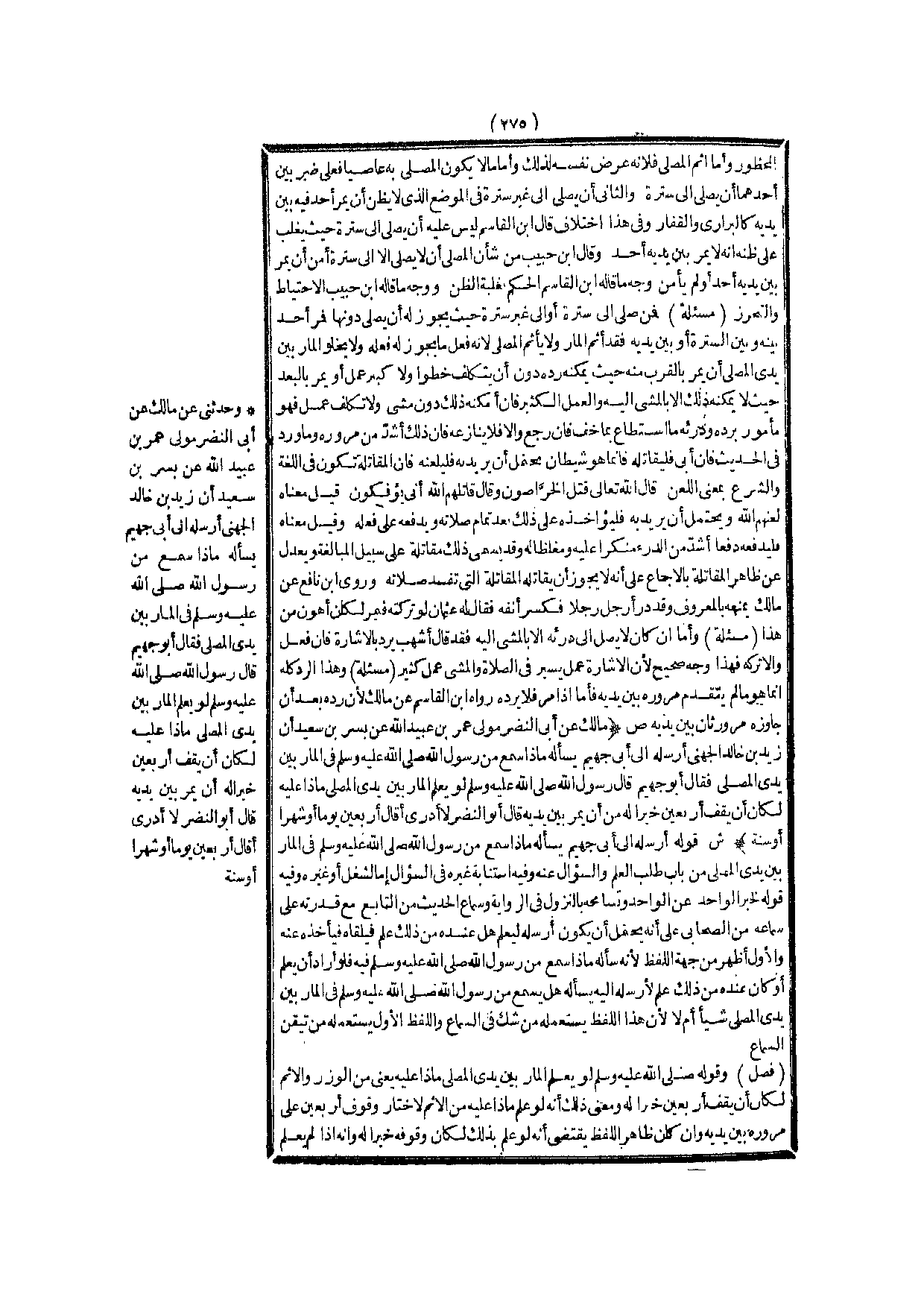 (ص) : (مَالِكٌ عَنْ أَبِي النَّضْرِ مَوْلَى عُمَرَ بْنِ عُبَيْدِ اللَّهِ عَنْ بُسْرِ بْنِ سَعِيدٍ أَنَّ زَيْدَ بْنَ خَالِدٍ الْجُهَنِيَّ أَرْسَلَهُ إلَى أَبِي جُهَيْمٍ يَسْأَلُهُ مَاذَا سَمِعَ مِنْ رَسُولِ اللَّهِ - صَلَّى اللَّهُ عَلَيْهِ وَسَلَّمَ - فِي الْمَارِّ بَيْنَ يَدَيْ الْمُصَلِّي فَقَالَ أَبُو جُهَيْمٍ قَالَ رَسُولُ اللَّهِ - صَلَّى اللَّهُ عَلَيْهِ وَسَلَّمَ - «لَوْ يَعْلَمُ الْمَارُّ بَيْنَ يَدَيْ الْمُصَلِّي مَاذَا عَلَيْهِ لَكَانَ أَنْ يَقِفَ أَرْبَعِينَ خَيْرًا لَهُ مِنْ أَنْ يَمُرَّ بَيْنَ يَدَيْهِ» قَالَ أَبُو النَّضْرِ لَا أَدْرِي أَقَالَ أَرْبَعِينَ يَوْمًا أَوْ شَهْرًا أَوْ سَنَةً) .