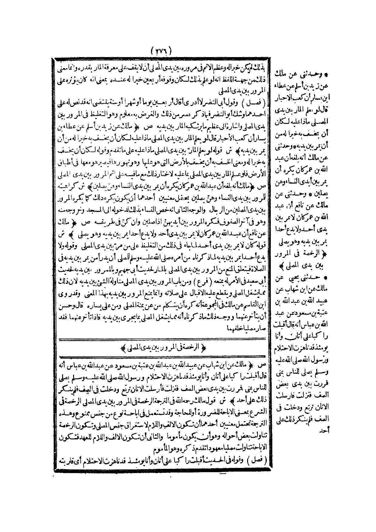 (ص) : (مَالِكٌ عَنْ نَافِعٍ أَنَّ عَبْدَ اللَّهِ بْنَ عُمَرَ كَانَ لَا يَمُرُّ بَيْنَ يَدَيْ أَحَدٍ وَلَا يَدَعُ أَحَدًا يَمُرُّ بَيْنَ يَدَيْهِ وَهُوَ يُصَلِّي) .