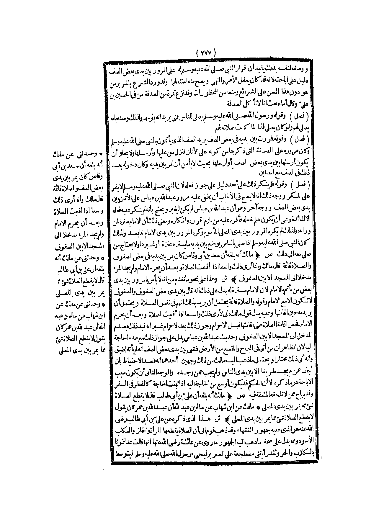 (ص) : (مَالِكٌ أَنَّهُ بَلَغَهُ أَنَّ عَلِيَّ بْنَ أَبِي طَالِبٍ قَالَ لَا يَقْطَعُ الصَّلَاةَ شَيْءٌ مِمَّا يَمُرُّ بَيْنَ يَدَيْ الْمُصَلِّي مَالِكٌ عَنْ ابْنِ شِهَابٍ عَنْ سَالِمِ بْنِ عَبْدِ اللَّهِ أَنَّ عَبْدَ اللَّهِ بْنَ عُمَرَ كَانَ يَقُولُ لَا يَقْطَعُ الصَّلَاةَ شَيْءٌ مِمَّا يَمُرُّ بَيْنَ يَدَيْ الْمُصَلِّي) .
