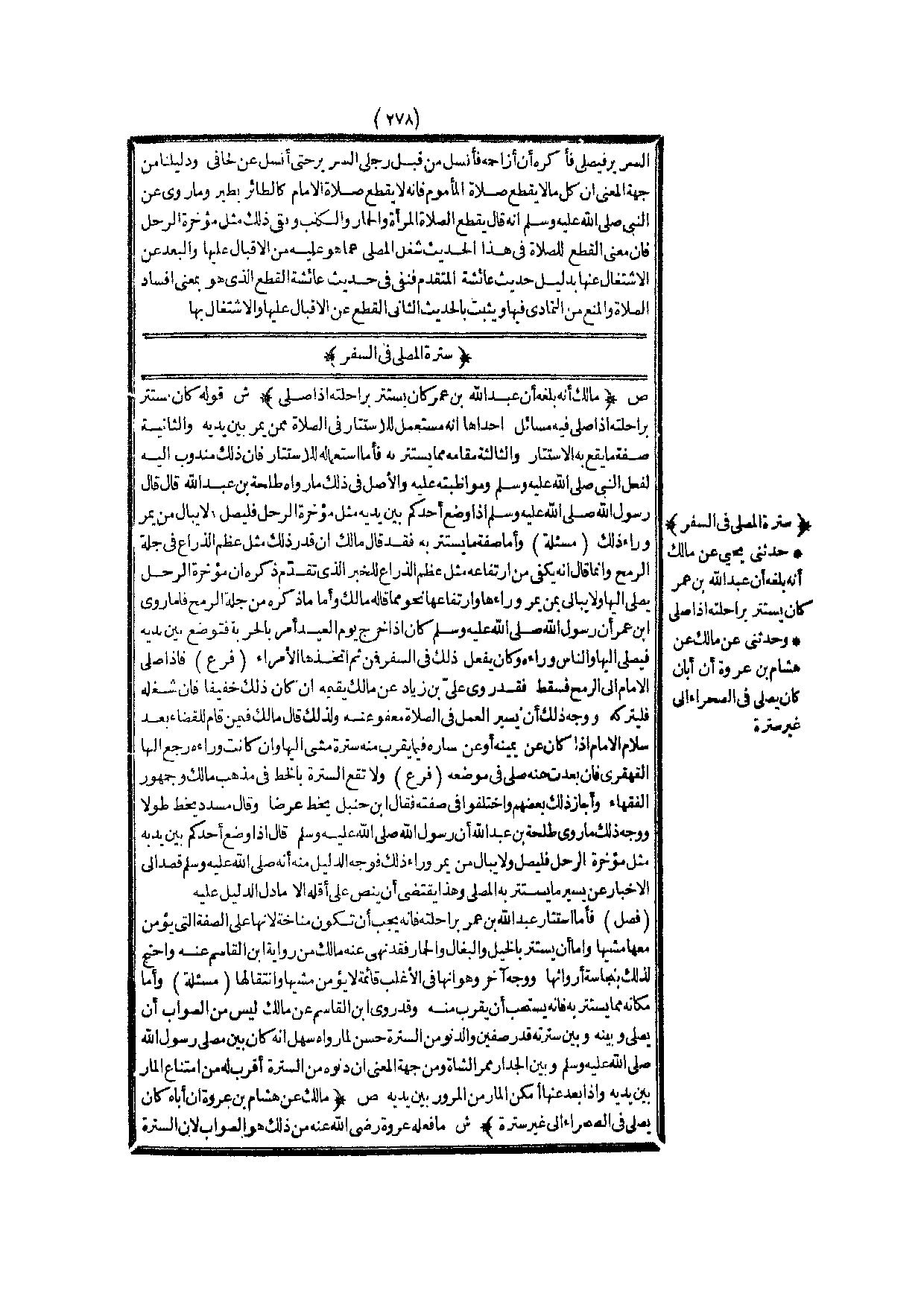 سُتْرَةُ الْمُصَلِّي فِي السَّفَرِ (ص) : (مَالِكٌ أَنَّهُ بَلَغَهُ أَنَّ عَبْدَ اللَّهِ بْنَ عُمَرَ كَانَ يَسْتَتِرُ بِرَاحِلَتِهِ إذَا صَلَّى) .
