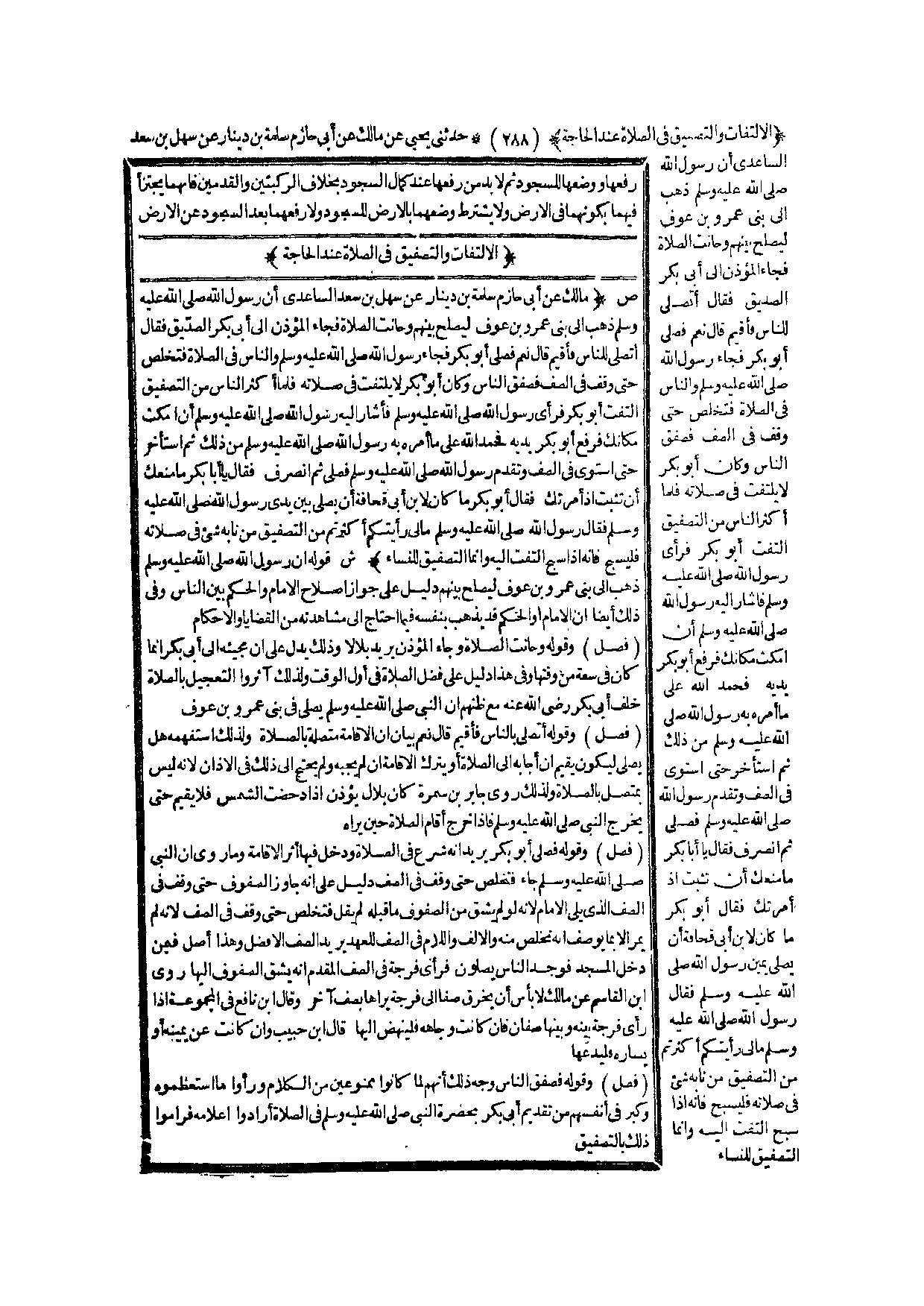 الِالْتِفَاتُ وَالتَّصْفِيقُ فِي الصَّلَاةِ عِنْدَ الْحَاجَةِ (ص) : (مَالِكٌ عَنْ أَبِي حَازِمٍ سَلَمَةَ بْنِ دِينَارٍ عَنْ سَهْلِ بْنِ سَعْدٍ السَّاعِدِيِّ «أَنَّ رَسُولَ اللَّهِ - صَلَّى اللَّهُ عَلَيْهِ وَسَلَّمَ - ذَهَبَ إلَى بَنِي عَمْرِو بْنِ عَوْفٍ لِيُصْلِحَ بَيْنَهُمْ وَحَانَتْ الصَّلَاةُ فَجَاءَ الْمُؤَذِّنُ إلَى أَبِي بَكْرٍ الصِّدِّيقِ فَقَالَ أَتُصَلِّي لِلنَّاسِ فَأُقِيمُ قَالَ نَعَمْ فَصَلَّى أَبُو بَكْرٍ فَجَاءَ رَسُولُ اللَّهِ - صَلَّى اللَّهُ عَلَيْهِ وَسَلَّمَ - وَالنَّاسُ فِي الصَّلَاةِ فَتَخَلَّصَ حَتَّى وَقَفَ فِي الصَّفِّ فَصَفَّقَ النَّاسُ وَكَانَ أَبُو بَكْرٍ لَا يَلْتَفِتُ فِي صَلَاتِهِ فَلَمَّا أَكْثَرَ النَّاسُ مِنْ التَّصْفِيقِ الْتَفَتَ أَبُو بَكْرٍ فَرَأَى رَسُولَ اللَّهِ - صَلَّى اللَّهُ عَلَيْهِ وَسَلَّمَ - فَأَشَارَ إلَيْهِ رَسُولُ اللَّهِ - صَلَّى اللَّهُ عَلَيْهِ وَسَلَّمَ - أَنْ اُمْكُثْ مَكَانَك فَرَفَعَ أَبُو بَكْرٍ يَدَيْهِ فَحَمِدَ اللَّهَ عَلَى مَا أَمَرَهُ بِهِ رَسُولُ اللَّهِ - صَلَّى اللَّهُ عَلَيْهِ وَسَلَّمَ - مِنْ ذَلِكَ ثُمَّ اسْتَأْخَرَ حَتَّى اسْتَوَى فِي الصَّفِّ وَتَقَدَّمَ رَسُولُ اللَّهِ - صَلَّى اللَّهُ عَلَيْهِ وَسَلَّمَ - فَصَلَّى ثُمَّ انْصَرَفَ فَقَالَ يَا أَبَا بَكْرٍ مَا مَنَعَك أَنْ تَثْبُتَ إذْ أَمَرْتُك فَقَالَ أَبُو بَكْرٍ مَا كَانَ لِابْنِ أَبِي قُحَافَةَ أَنْ يُصَلِّيَ بَيْنَ يَدَيْ رَسُولِ اللَّهِ - صَلَّى اللَّهُ عَلَيْهِ وَسَلَّمَ - فَقَالَ رَسُولُ اللَّهِ - صَلَّى اللَّهُ عَلَيْهِ وَسَلَّمَ - مَالِي رَأَيْتُكُمْ أَكْثَرْتُمْ مِنْ التَّصْفِيقِ مَنْ نَابَهُ شَيْءٌ فِي صَلَاتِهِ فَلْيُسَبِّحْ فَإِنَّهُ إذَا سَبَّحَ اُلْتُفِتَ إلَيْهِ وَإِنَّمَا التَّصْفِيقُ لِلنِّسَاءِ» )