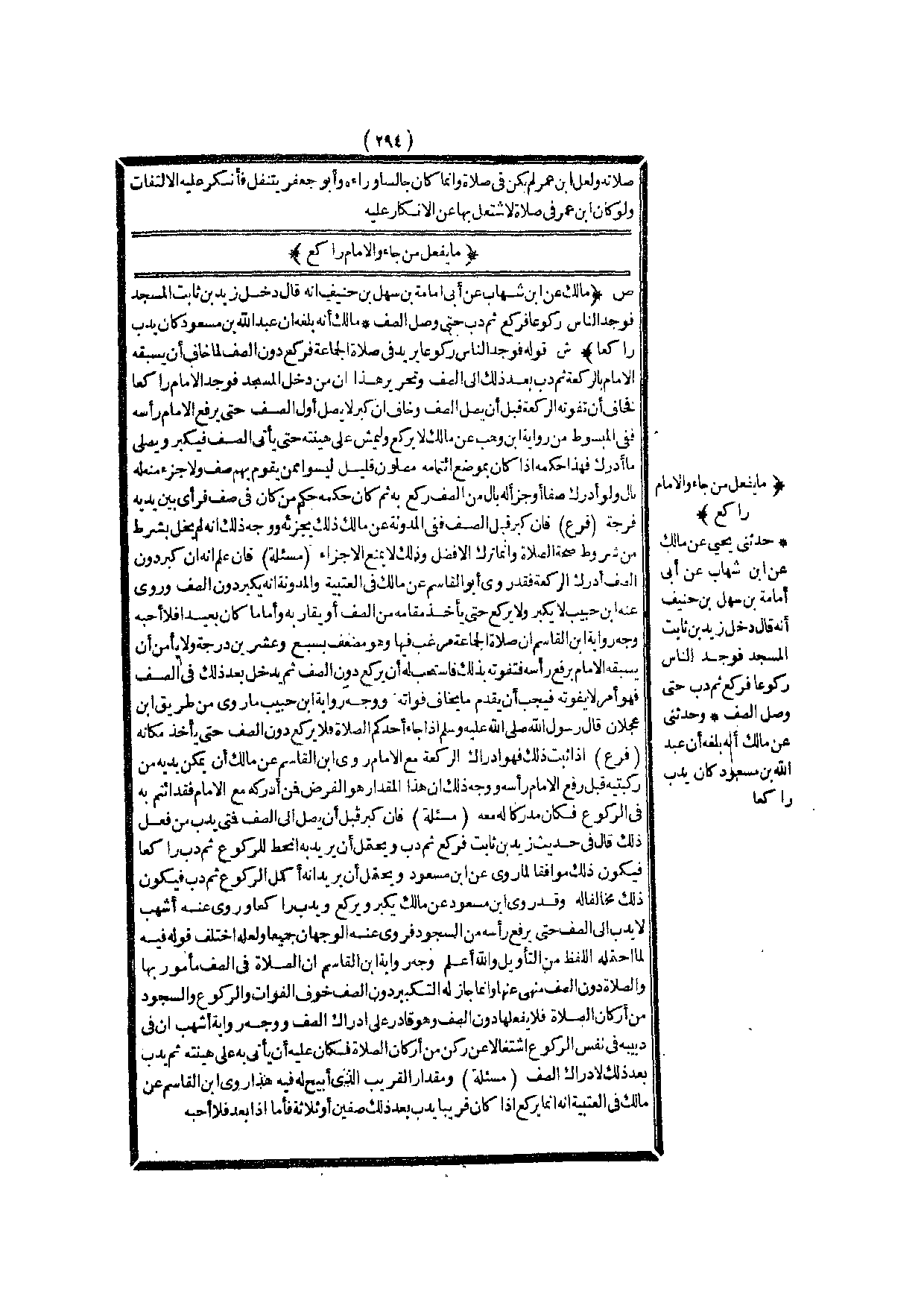 مَا يَفْعَلُ مَنْ جَاءَ وَالْإِمَامُ رَاكِعٌ (ص) : (مَالِكٌ عَنْ ابْنِ شِهَابٍ عَنْ أَبِي أُمَامَةَ بْنِ سَهْلِ بْنِ حُنَيْفٍ أَنَّهُ قَالَ دَخَلَ زَيْدُ بْنُ ثَابِتٍ الْمَسْجِدَ فَوَجَدَ النَّاسَ رُكُوعًا فَرَكَعَ ثُمَّ دَبَّ حَتَّى وَصَلَ الصَّفَّ مَالِكٌ أَنَّهُ بَلَغَهُ أَنَّ عَبْدَ اللَّهِ بْنَ مَسْعُودٍ كَانَ يَدِبُّ رَاكِعًا) .