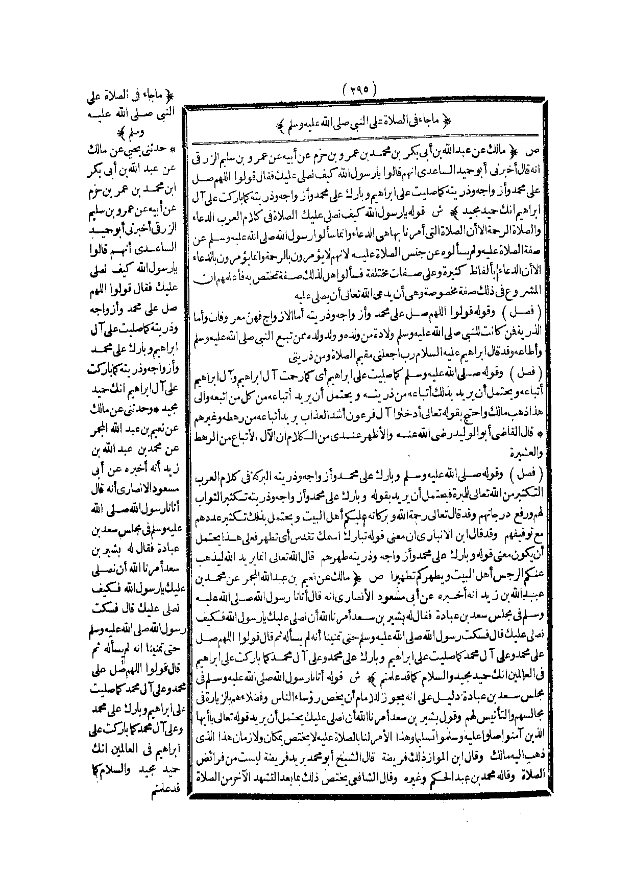 (ص) : (مَالِكٌ عَنْ نُعَيْمِ بْنِ عَبْدِ اللَّهِ الْمُجْمِرِ عَنْ مُحَمَّدِ بْنِ عَبْدِ اللَّهِ بْنِ زَيْدٍ أَنَّهُ أَخْبَرَهُ عَنْ أَبِي مَسْعُودٍ الْأَنْصَارِيِّ أَنَّهُ قَالَ أَتَانَا رَسُولُ اللَّهِ - صَلَّى اللَّهُ عَلَيْهِ وَسَلَّمَ - فِي مَجْلِسِ سَعْدِ بْنِ عُبَادَةَ فَقَالَ لَهُ بَشِيرُ بْنُ سَعْدٍ «أَمَرَنَا اللَّهُ أَنْ نُصَلِّيَ عَلَيْك يَا رَسُولَ اللَّهِ فَكَيْفَ نُصَلِّي عَلَيْك قَالَ فَسَكَتَ رَسُولُ اللَّهِ - صَلَّى اللَّهُ عَلَيْهِ وَسَلَّمَ - حَتَّى تَمَنَّيْنَا أَنَّهُ لَمْ يَسْأَلْهُ ثُمَّ قَالَ قُولُوا اللَّهُمَّ صَلِّ عَلَى مُحَمَّدٍ وَعَلَى آلِ مُحَمَّدٍ كَمَا صَلَّيْت عَلَى إبْرَاهِيمَ وَبَارِكْ عَلَى مُحَمَّدٍ وَعَلَى آلِ مُحَمَّدٍ كَمَا بَارَكْت عَلَى إبْرَاهِيمَ فِي الْعَالَمِينَ إنَّك حَمِيدٌ مَجِيدٌ وَالسَّلَامُ كَمَا قَدْ عَلِمْتُمْ» ) .