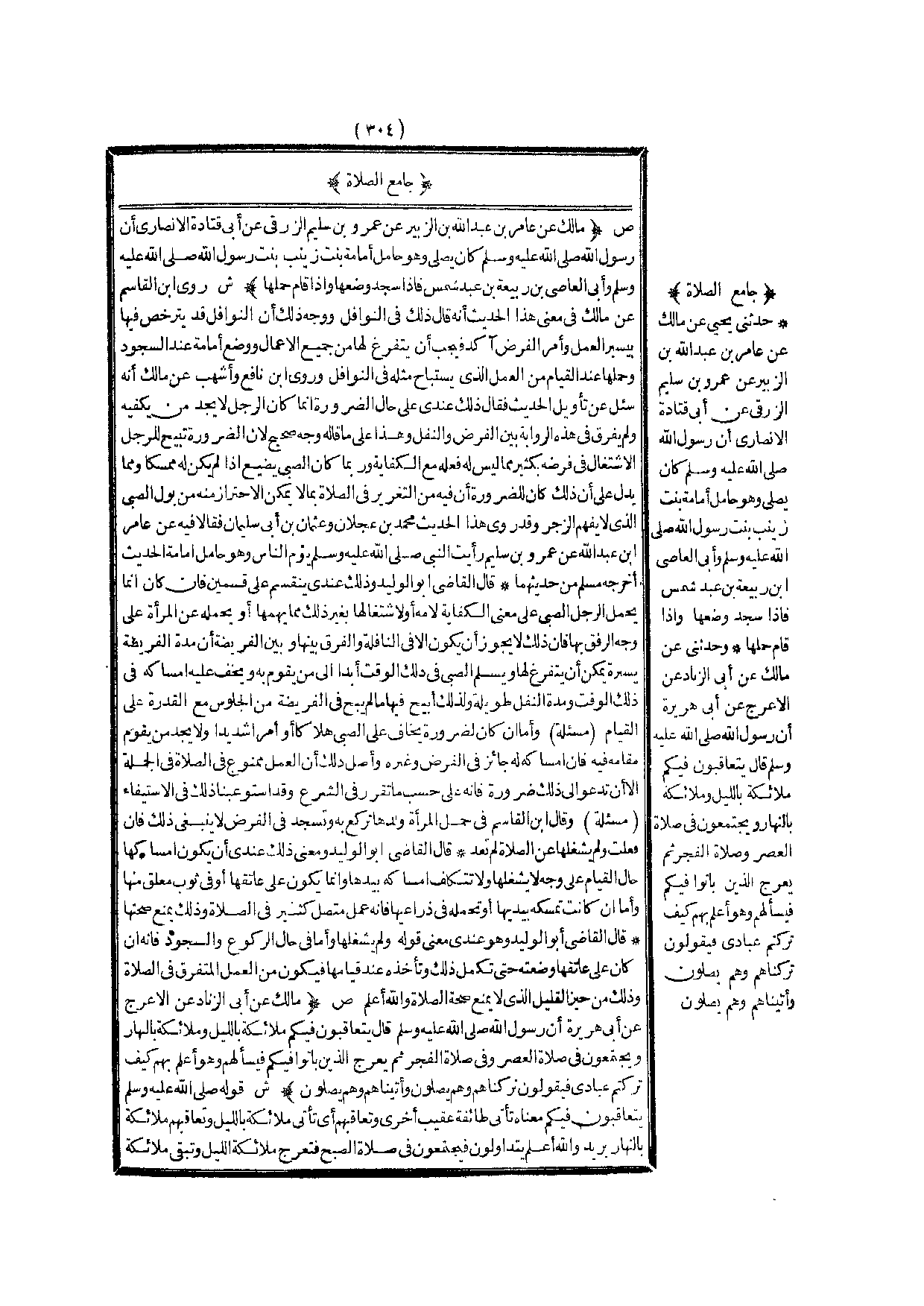 جَامِعُ الصَّلَاةِ (ص) : (مَالِكٌ عَنْ عَامِرِ بْنِ عَبْدِ اللَّهِ بْنِ الزُّبَيْرِ عَنْ عَمْرِو بْنِ سُلَيْمٍ الزُّرَقِيِّ عَنْ أَبِي قَتَادَةَ الْأَنْصَارِيِّ أَنَّ «رَسُولَ اللَّهِ - صَلَّى اللَّهُ عَلَيْهِ وَسَلَّمَ - كَانَ يُصَلِّي وَهُوَ حَامِلٌ أُمَامَةَ بِنْتَ زَيْنَبَ بِنْتِ رَسُولِ اللَّهِ - صَلَّى اللَّهُ عَلَيْهِ وَسَلَّمَ - وَأَبِي الْعَاصِي بْنِ رَبِيعَةَ بْنِ عَبْدِ شَمْسٍ فَإِذَا سَجَدَ وَضَعَهَا وَإِذَا قَامَ حَمَلَهَا» ) .