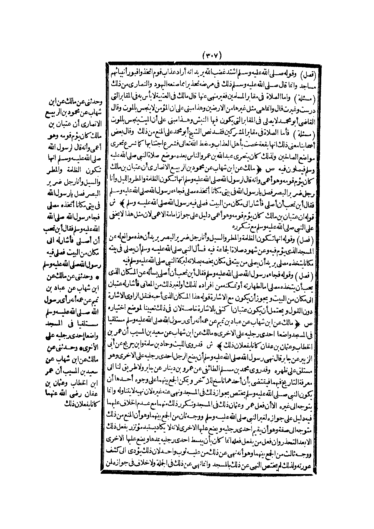(ص) : (مَالِكٌ عَنْ ابْنِ شِهَابٍ عَنْ مَحْمُودِ بْنِ الرَّبِيعِ الْأَنْصَارِيِّ أَنَّ «عِتْبَانَ بْنَ مَالِكٍ كَانَ يَؤُمُّ قَوْمَهُ وَهُوَ أَعْمَى وَأَنَّهُ قَالَ لِرَسُولِ اللَّهِ - صَلَّى اللَّهُ عَلَيْهِ وَسَلَّمَ - إنَّهَا تَكُونُ الظُّلْمَةُ وَالْمَطَرُ وَاللَّيْلُ وَأَنَا رَجُلٌ ضَرِيرُ الْبَصَرِ فَصَلِّ يَا رَسُولَ اللَّهِ فِي بَيْتِي مَكَانًا أَتَّخِذُهُ مُصَلًّى فَجَاءَهُ رَسُولُ اللَّهِ - صَلَّى اللَّهُ عَلَيْهِ وَسَلَّمَ - فَقَالَ أَيْنَ تُحِبُّ أَنْ أُصَلِّيَ فَأَشَارَ إلَى مَكَان مِنْ الْبَيْتِ فَصَلَّى فِيهِ رَسُولُ اللَّهِ - صَلَّى اللَّهُ عَلَيْهِ وَسَلَّمَ -» ) .