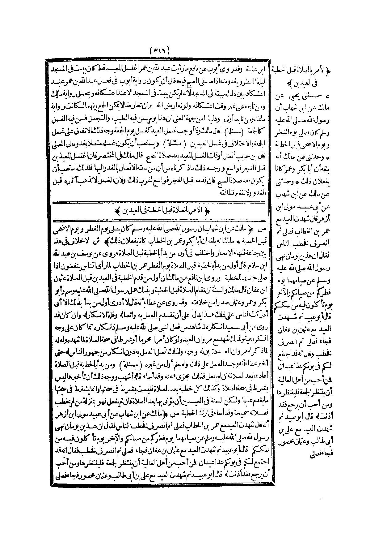 الْأَمْرُ بِالصَّلَاةِ قَبْلَ الْخُطْبَةِ فِي الْعِيدَيْنِ (ص) : (مَالِكٌ عَنْ ابْنِ شِهَابٍ «أَنَّ رَسُولَ اللَّهِ - صَلَّى اللَّهُ عَلَيْهِ وَسَلَّمَ - كَانَ يُصَلِّي يَوْمَ الْفِطْرِ وَيَوْمَ الْأَضْحَى قَبْلَ الْخُطْبَةِ» مَالِكٌ أَنَّهُ بَلَغَهُ أَنَّ أَبَا بَكْرٍ وَعُمَرَ بْنَ الْخَطَّابِ كَانَا يَفْعَلَانِ ذَلِكَ) .