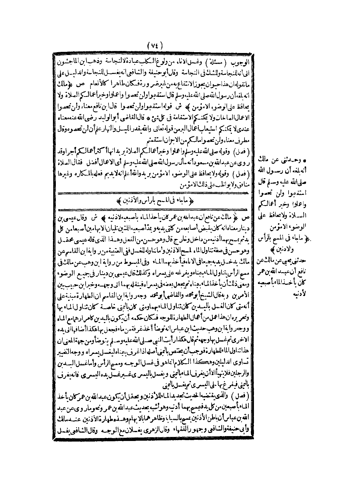 (فَصْلٌ) وَاَلَّذِي يَقْتَضِيهِ الْحَدِيثُ تَجْدِيدَ الْمَاءِ لِلْأُذُنَيْنِ وَيَحْتَمِلُ أَنْ يَكُونَ عَبْدُ اللَّهِ بْنُ عُمَرَ كَانَ يَأْخُذُ الْمَاءَ بِأُصْبُعَيْنِ مِنْ كُلِّ يَدٍ فَيَمْسَحُ بِهِمَا أُذُنَيْهِ وَهُوَ أَشْبَهُ بِحَدِيثِ عَبْدِ اللَّهِ بْنِ عُمَرَ وَنَحْوِ مَا رُوِيَ عَنْ عَبْدِ اللَّهِ بْنِ عَبَّاسٍ أَنَّ بَاطِنَ الْأُذُنَيْنِ يُمْسَحُ بِالسَّبَّابَةِ وَظَاهِرَهُمَا بِالْإِبْهَامِ وَهَذِهِ طَهَارَةُ الْأُذُنَيْنِ عِنْدَ مَالِكٍ وَأَبِي حَنِيفَةَ وَالشَّافِعِيِّ وَجُمْهُورِ الْفُقَهَاءِ.