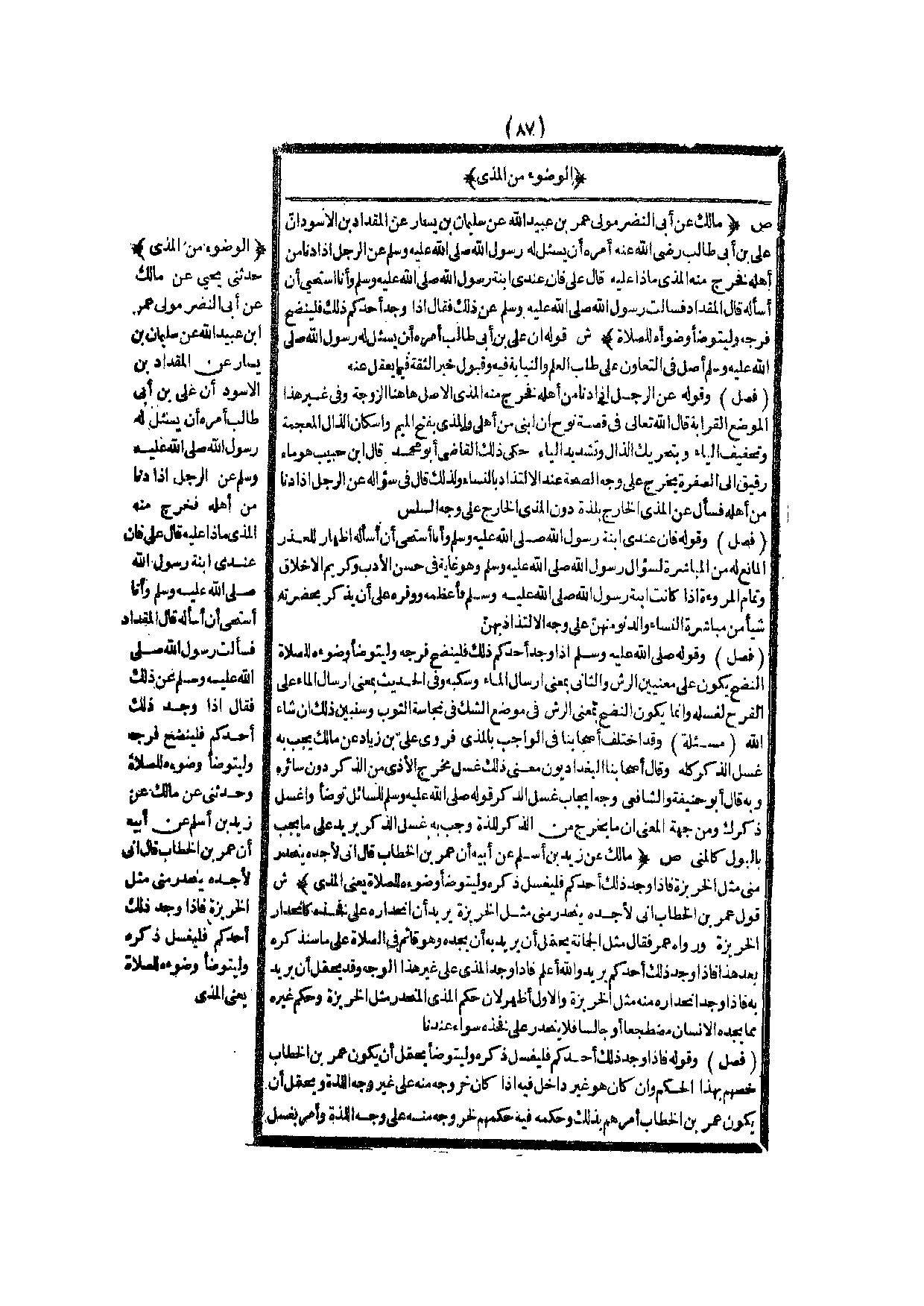 الْوُضُوءُ مِنْ الْمَذْيِ (ص) : (مَالِكٌ عَنْ أَبِي النَّضْرِ مَوْلَى عُمَرَ بْنِ عُبَيْدِ اللَّهِ عَنْ سُلَيْمَانَ بْنِ يَسَارٍ عَنْ الْمِقْدَادِ بْنِ الْأَسْوَدِ «أَنَّ عَلِيَّ بْنَ أَبِي طَالِبٍ - رَضِيَ اللَّهُ عَنْهُ - أَمَرَهُ أَنْ يَسْأَلَ لَهُ رَسُولَ اللَّهِ - صَلَّى اللَّهُ عَلَيْهِ وَسَلَّمَ - عَنْ الرَّجُلِ إذَا دَنَا مِنْ أَهْلِهِ فَخَرَجَ مِنْهُ الْمَذْيُ مَاذَا عَلَيْهِ قَالَ عَلِيٌّ فَإِنَّ عِنْدِي ابْنَةَ رَسُولِ اللَّهِ - صَلَّى اللَّهُ عَلَيْهِ وَسَلَّمَ - وَأَنَا أَسْتَحِي أَنْ أَسْأَلَهُ قَالَ الْمِقْدَادُ فَسَأَلْت رَسُولَ اللَّهِ - صَلَّى اللَّهُ عَلَيْهِ وَسَلَّمَ - عَنْ ذَلِكَ فَقَالَ إذَا وَجَدَ أَحَدُكُمْ ذَلِكَ فَلْيَنْضَحْ فَرْجَهُ وَلْيَتَوَضَّأْ وُضُوءَهُ لِلصَّلَاةِ» ) .