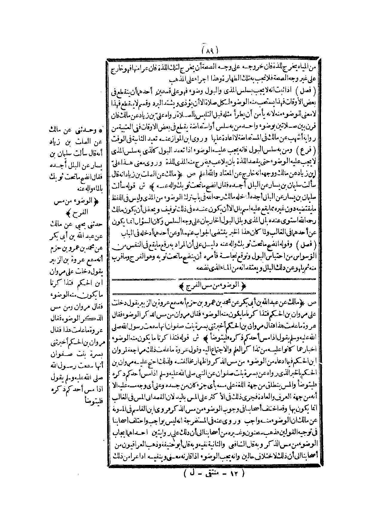 الْوُضُوءُ مِنْ مَسِّ الْفَرْجِ (ص) : (مَالِكٌ عَنْ عَبْدِ اللَّهِ بْنِ أَبِي بَكْرٍ عَنْ مُحَمَّدِ بْنِ عَمْرِو بْنِ حَزْمٍ أَنَّهُ سَمِعَ عُرْوَةَ بْنَ الزُّبَيْرِ يَقُولُ دَخَلْت عَلَى مَرْوَانَ بْنِ الْحَكَمِ فَتَذَاكَرْنَا مَا يَكُونُ مِنْهُ الْوُضُوءُ فَقَالَ مَرْوَانُ مِنْ مَسِّ الذَّكَرِ الْوُضُوءُ، فَقَالَ عُرْوَةُ مَا عَلِمْت هَذَا فَقَالَ مَرْوَانُ بْنُ الْحَكَمِ أَخْبَرَتْنِي بُسْرَةُ بِنْتُ صَفْوَانَ أَنَّهَا سَمِعَتْ رَسُولَ اللَّهِ - صَلَّى اللَّهُ عَلَيْهِ وَسَلَّمَ - يَقُولُ «إذَا مَسَّ أَحَدُكُمْ ذَكَرَهُ فَلْيَتَوَضَّأْ» ) .
