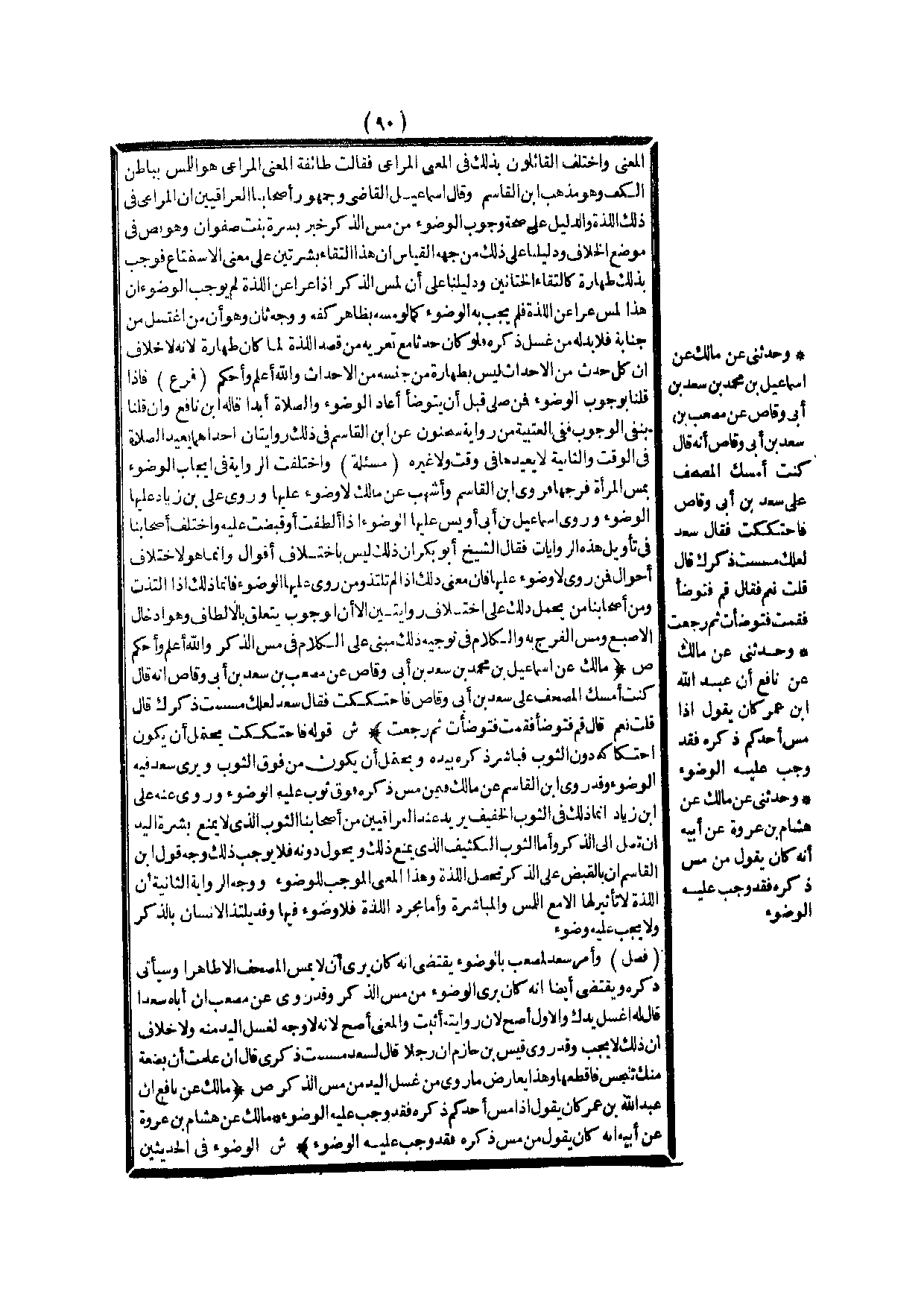 (ص) : (مَالِكٌ عَنْ إسْمَاعِيلَ بْنِ مُحَمَّدِ بْنِ سَعْدِ بْنِ أَبِي وَقَّاصٍ عَنْ مُصْعَبِ بْنِ سَعْدِ بْنِ أَبِي وَقَّاصٍ أَنَّهُ قَالَ كُنْت أَمْسِكُ الْمُصْحَفَ عَلَى سَعْدِ بْنِ أَبِي وَقَّاصٍ فَاحْتَكَكْت فَقَالَ سَعْدٌ لَعَلَّك مَسِسْت ذَكَرَك قَالَ قُلْت نَعَمْ قَالَ قُمْ فَتَوَضَّأْ فَقُمْت فَتَوَضَّأْت ثُمَّ رَجَعَتْ) .