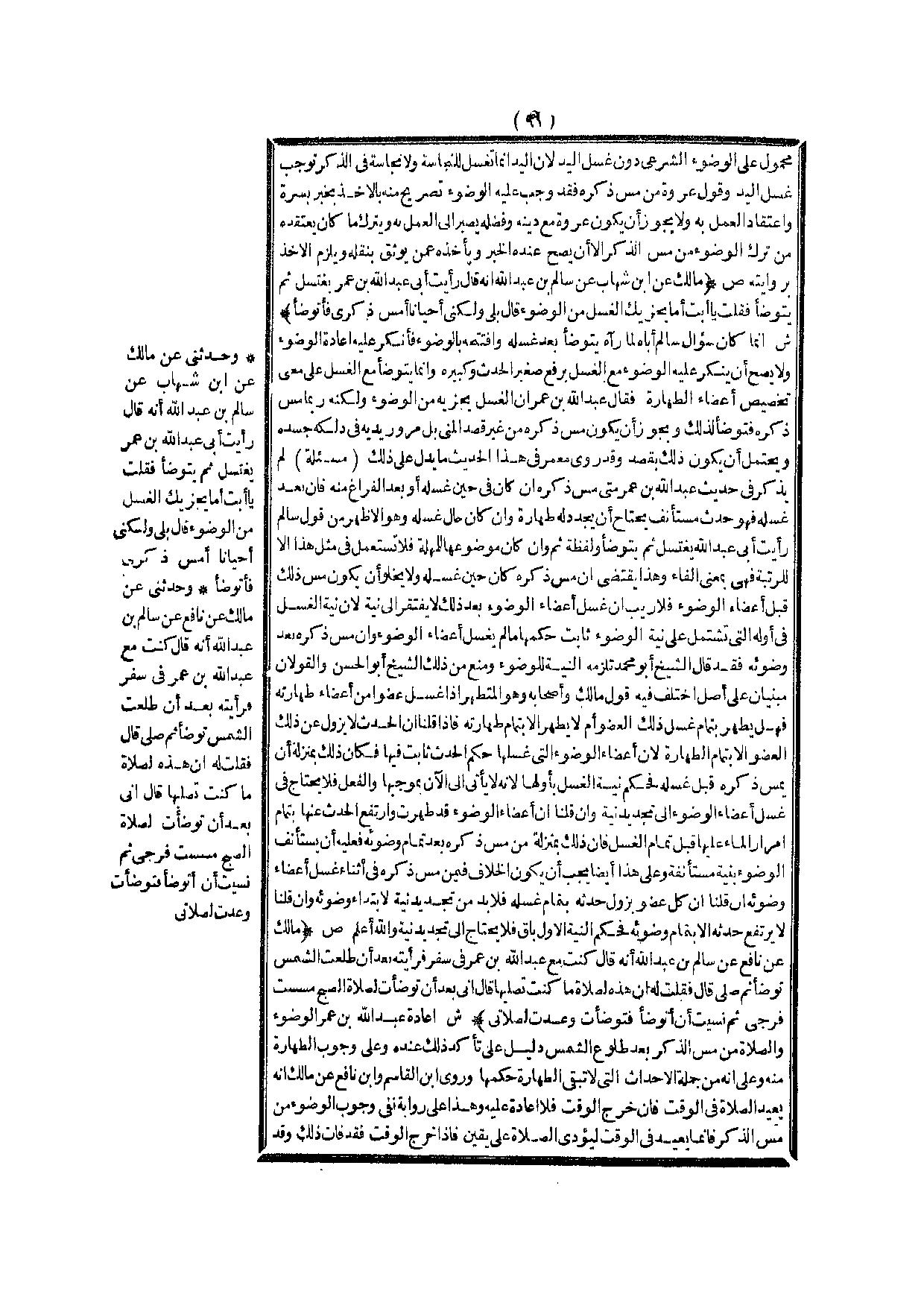 (ص) : (مَالِكٌ عَنْ نَافِعِ عَنْ سَالِمِ بْنِ عَبْدِ اللَّهِ أَنَّهُ قَالَ كُنْت مَعَ عَبْدِ اللَّهِ بْنِ عُمَرَ فِي سَفَرٍ فَرَأَيْته بَعْدَ أَنْ طَلَعَتْ الشَّمْسُ تَوَضَّأَ ثُمَّ صَلَّى قَالَ فَقُلْت لَهُ إنَّ هَذِهِ لَصَلَاةٌ مَا كُنْت تُصَلِّيهَا قَالَ إنِّي بَعْدَ أَنْ تَوَضَّأْتُ لِصَلَاةِ الصُّبْحِ مَسِسْت فَرْجِي ثُمَّ نَسِيتُ أَنْ أَتَوَضَّأَ فَتَوَضَّأْت وَعُدْت لِصَلَاتِي) .