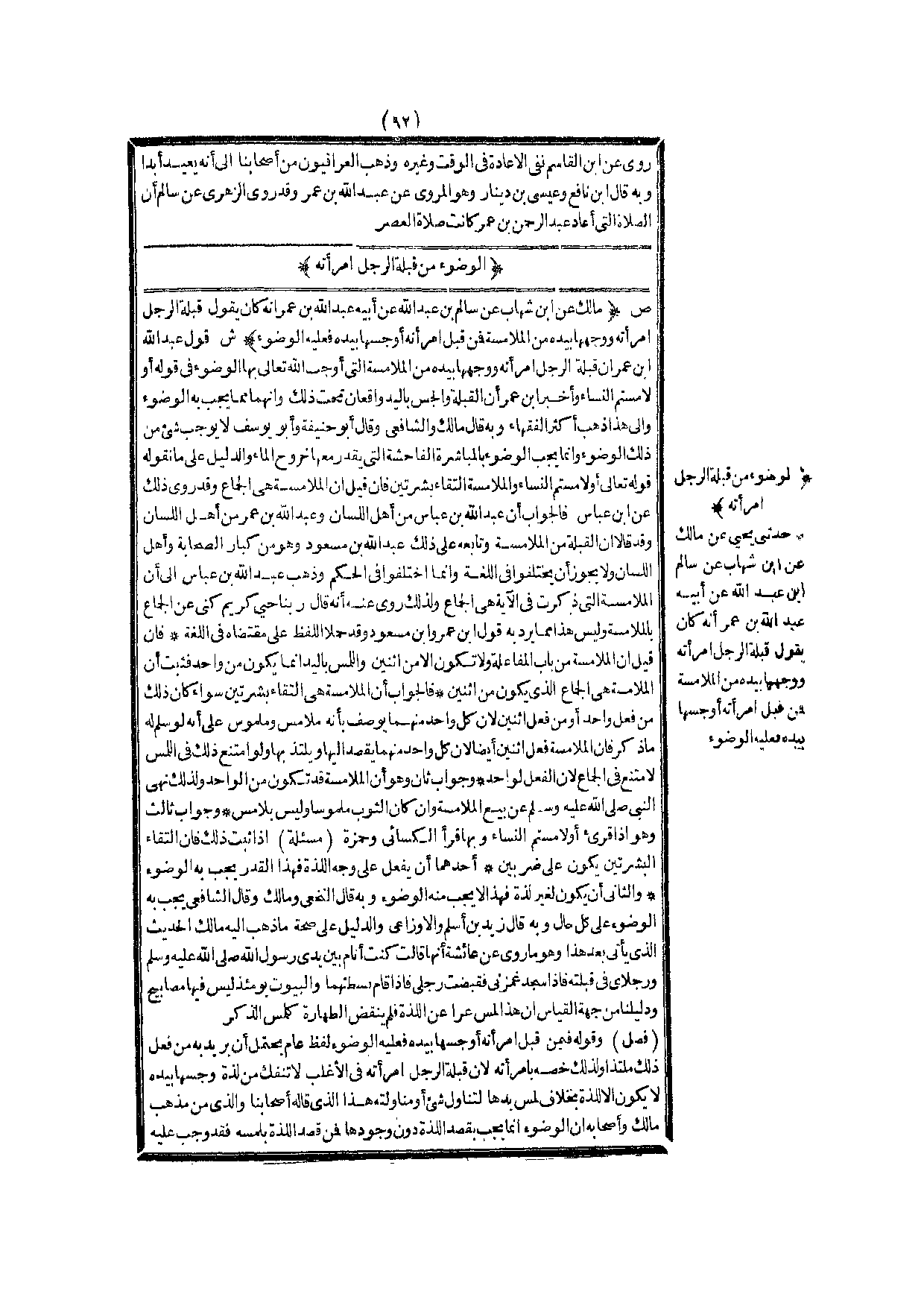 الْوُضُوءُ مِنْ قُبْلَةِ الرَّجُلِ امْرَأَتَهُ (ص) : (مَالِكٌ عَنْ ابْنِ شِهَابٍ عَنْ سَالِمِ بْنِ عَبْدِ اللَّهِ عَنْ أَبِيهِ عَبْدِ اللَّهِ بْنِ عُمَرَ أَنَّهُ كَانَ يَقُولُ قُبْلَةُ الرَّجُلِ امْرَأَتَهُ أَوْ جَسُّهَا بِيَدِهِ مِنْ الْمُلَامَسَةِ فَمَنْ قَبَّلَ امْرَأَتَهُ أَوْ جَسَّهَا بِيَدِهِ فَعَلَيْهِ الْوُضُوءُ) .