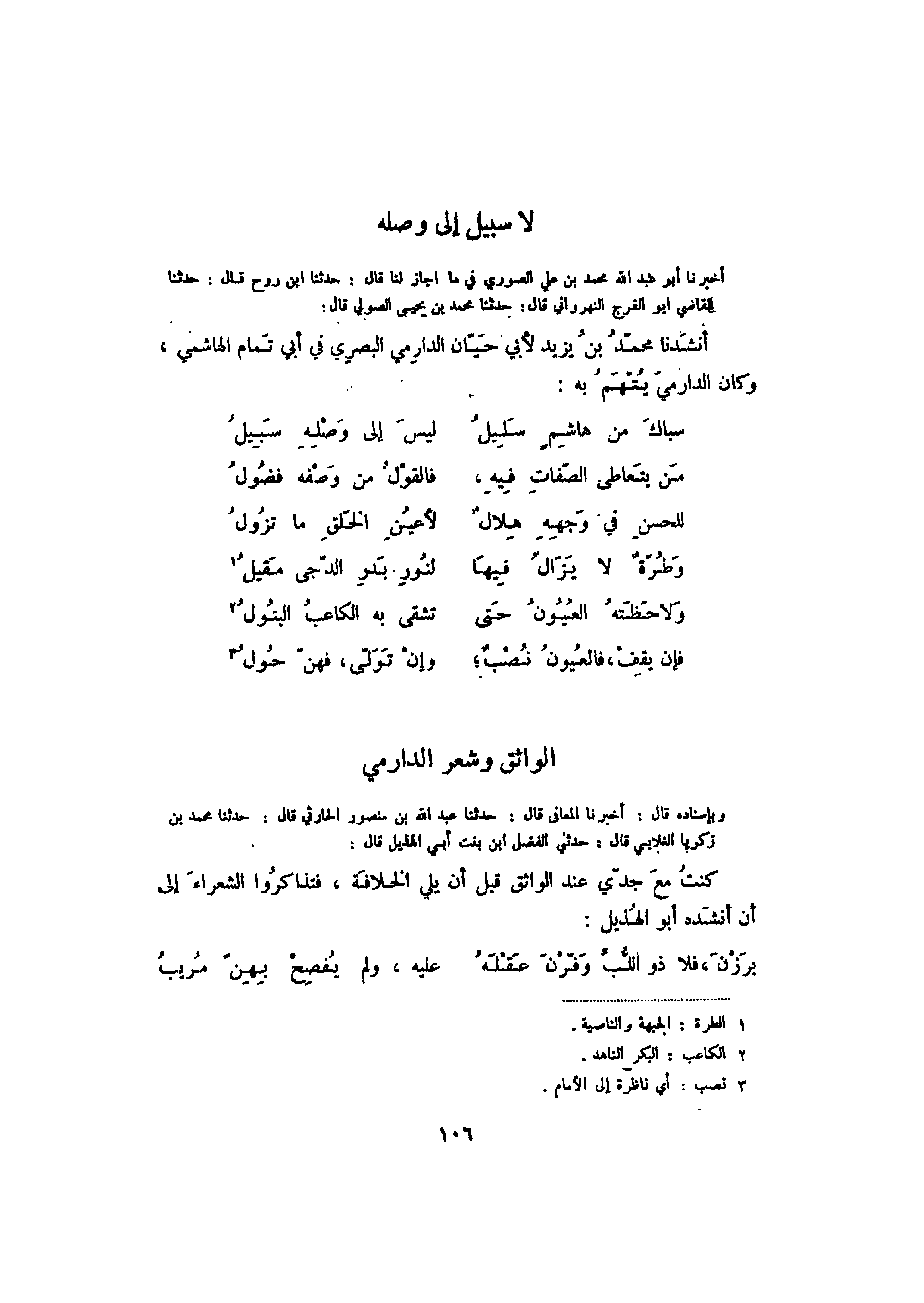 أخبرنا أبو عبد الله محمد بن علي الصوري في ما أجاز لنا قال: حدثنا ابن روح قال: حدثنا القاضي أبو الفرج النهرواني قال: حدثنا محمد بن يحيى الصولي قال: أنشدنا محمد بن يزيد لأبي حيان الدارمي البصري في أبي تمام الهاشمي، وكان الدارمي يتهم به: