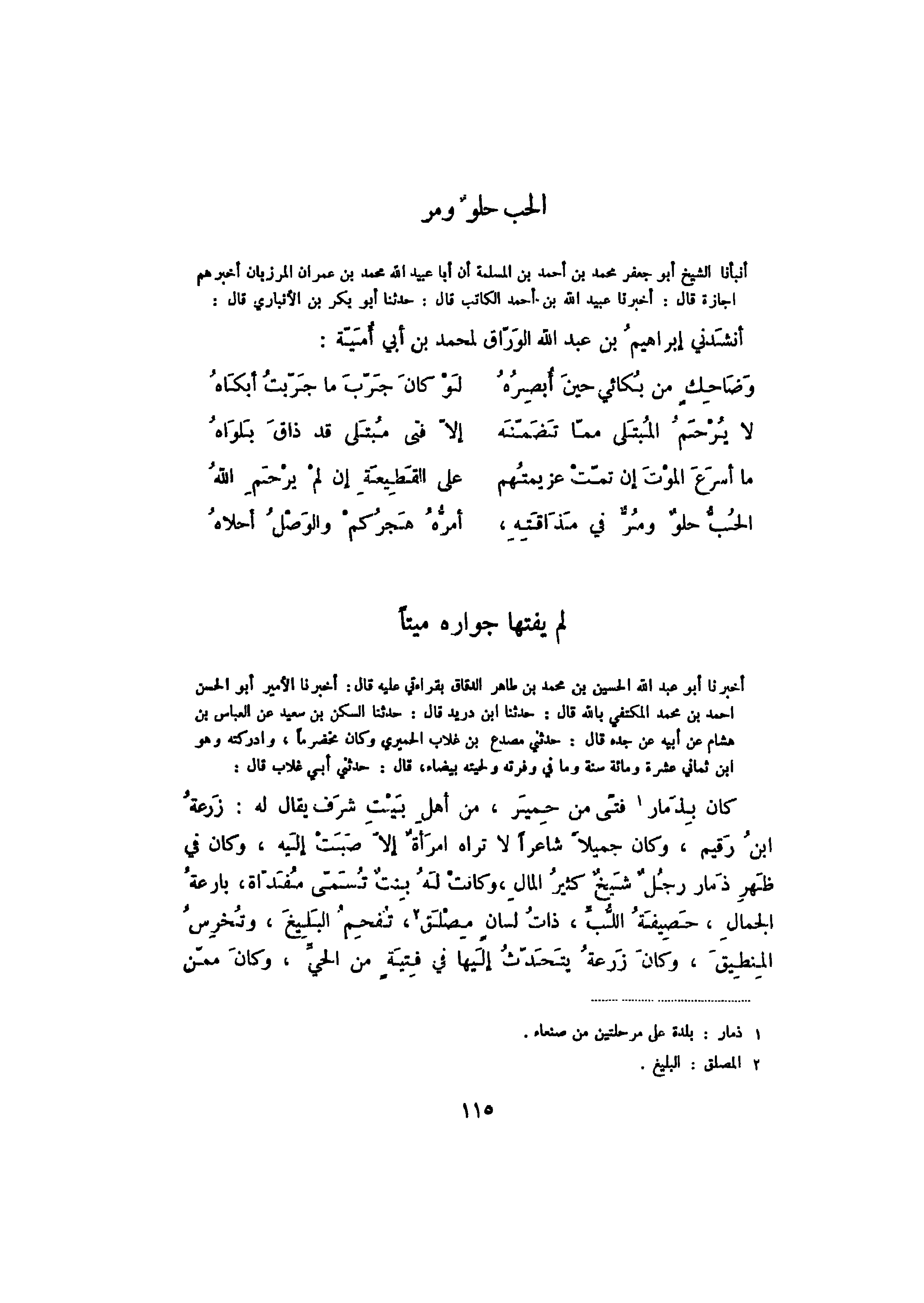 أنبأنا الشيخ أبو جعفر محمد بن أحمد بن المسلمة أن أبا عبيد الله محمد بن عمران المرزبان أخبرهم إجازة قال: أخبرنا عبيد الله بن أحمد الكاتب قال: حدثنا أبو بكر بن الأنباري قال: أنشدني إبراهيم بن عبد الله الوراق لمحمد بن أبي أمية: