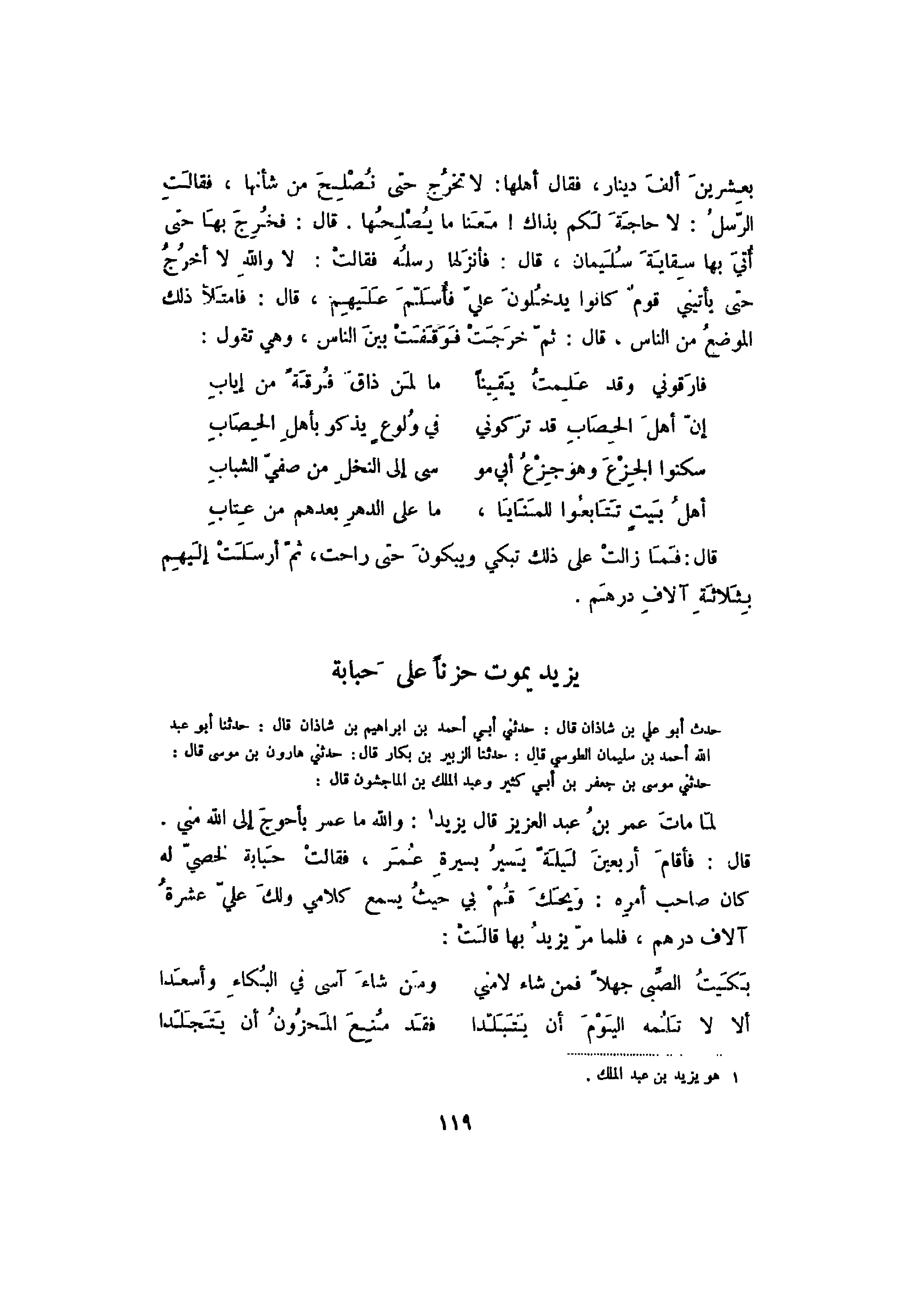 قال: فأقام أربعين ليلةً يسير بسيرة عمر، فقالت حبابة لخصي له كان صاحب أمره: ويحك قم بي حيث يسمع كلامي ولك علي عشرة آلاف درهم، فلما مر يزيد بها قالت: