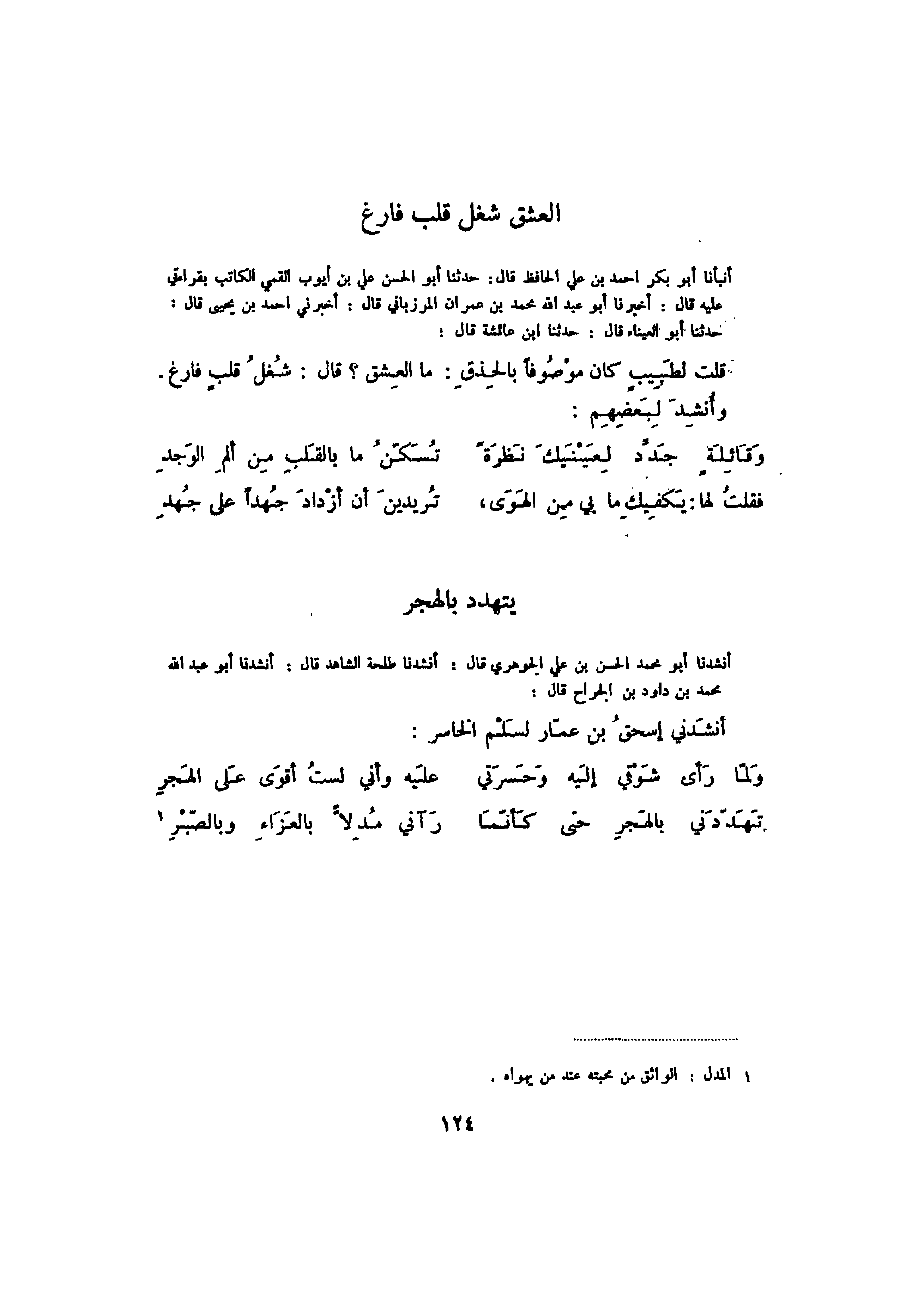 أنبأنا أبو بكر أحمد بن علي الحافظ قال: حدثنا أبو الحسن علي بن أيوب القمي بقراءتي عليه قال: أخبرنا أبو عبد الله محمد بن عمران المرزياني قال: أخبرني أحمد بن يحيى قال: حدثنا أبو العيناء قال: حدثنا ابن عائشة قال: قلت لطبيبٍ كان موصوفاً بالحذق: ما العشق؟ قال: شغل قلب فارغ.