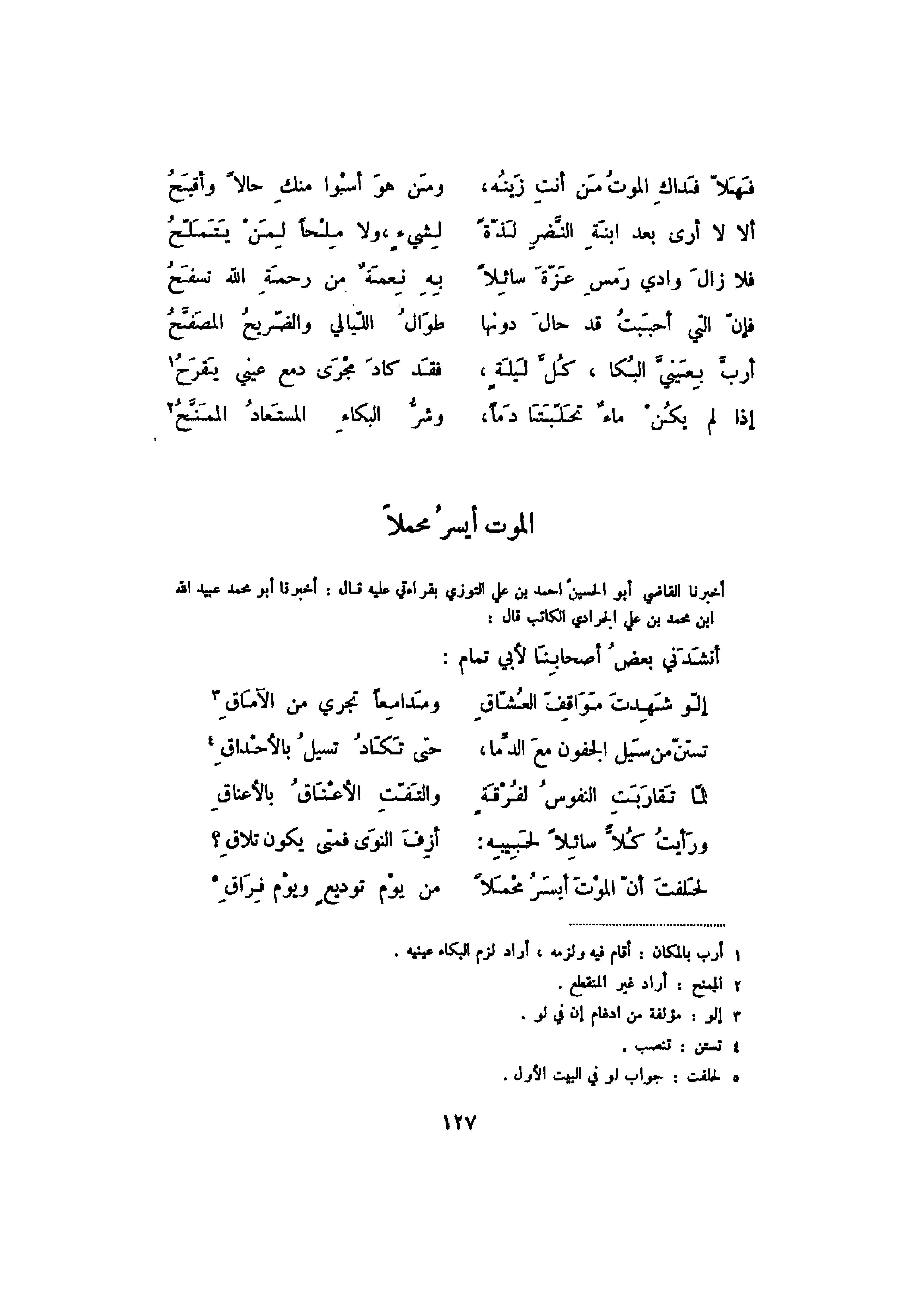 فَهَلاّ فَداكِ الموتُ مَن أنتِ زَينُه، ... ومَن هوَ أسْوا منكِ حالاً وأقبَحُ.