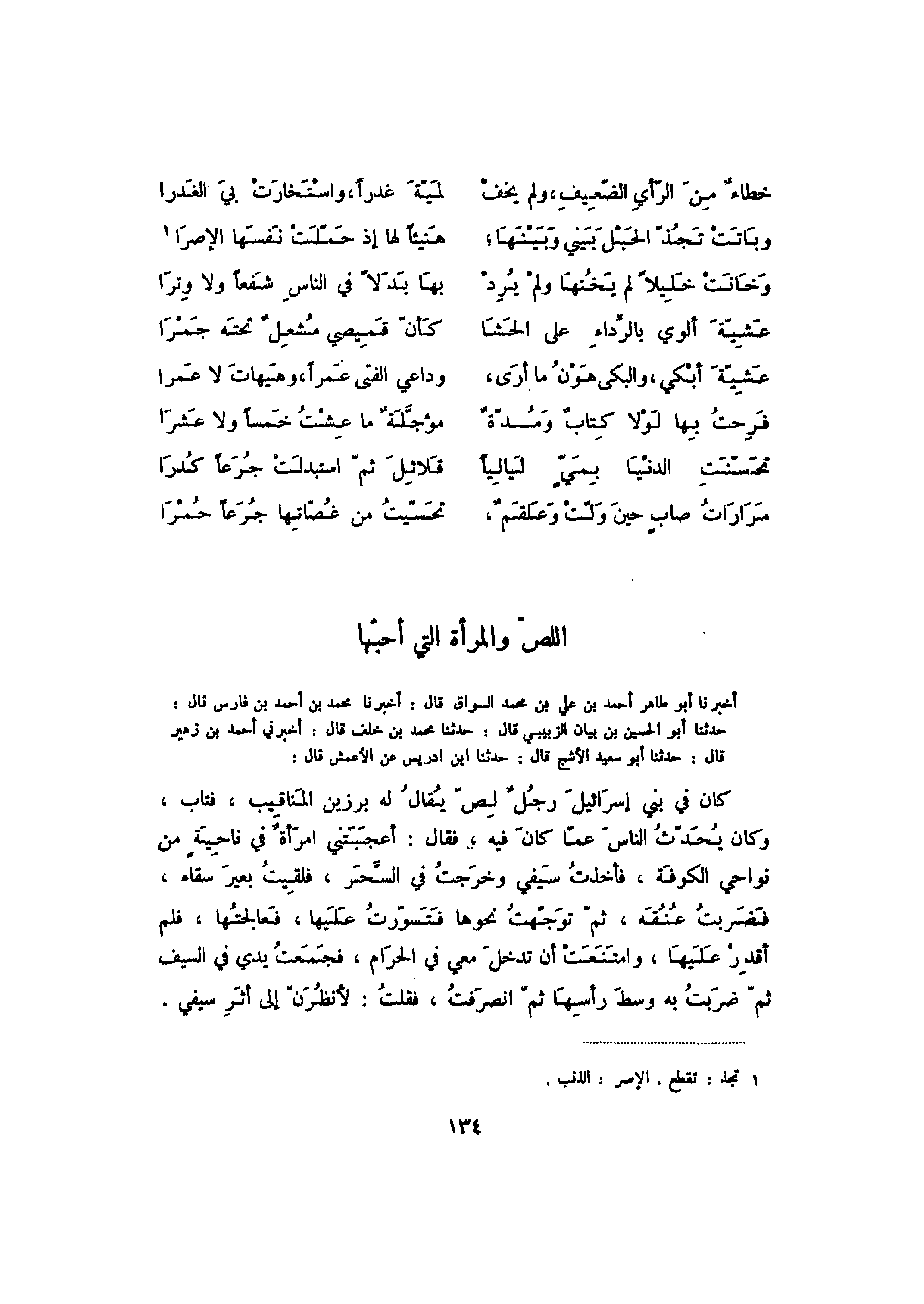 أخبرنا أبو طاهر أحمد بن علي بن محمد السواق قال: أخبرنا محمد بن أحمد بن فارس قال: حدثنا أبو الحسين بن بيان الزبيبي قال: حدثنا محمد بن خلف قال: أخبرني أحمد بن زهير قال: حدثنا أبو سعيد الأشج قال: حدثنا ابن إدريس عن الأعمش قال: كان في بني إسرائيل رجل لص يقال له برزين المناقيب، فتاب وكان يحدث الناس عما مان فيه، فقال: أعجبني امرأة في ناحية من نواحي الكوفة، فأخذت سيفي وخرجت في السحر، فلقيت بعير سقاء، فضربت عنقه، ث توجهت نحوها فتسورت عليها، فعالجتها، فلم أقدر عليها، وامتنعت أن تدخل معي في الحرام، فجمعت يدي في السيف ثم ضربت به وسط رأسها ثم انصرفت، فقلت: لأنظرن إلى أثر سيفي.