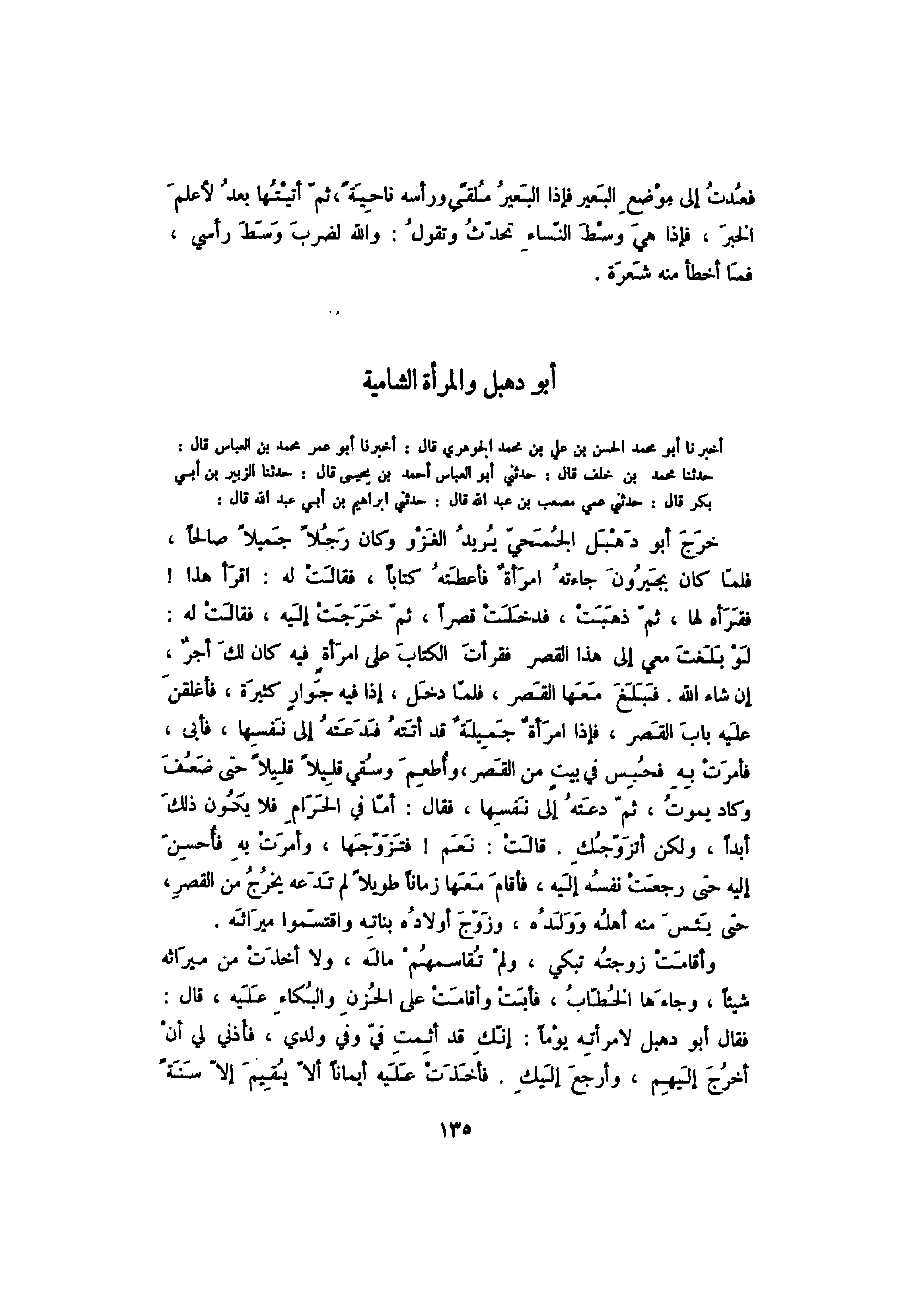 أخبرنا أبو محمد الحسن بن محمد الجوهري قال: أخبرنا أبو عمر محمد بن العباس قال: حدثنا محمد بن خلف قال: حدثني أبو العابس أحمد بن يحيى قال: حدثنا الزبير بن أبي بكر قال: حدثني عمي مصعب بن عبد الله قال: حدثني إبراهيم بن أبي عبد الله قال: خرج أبو دهبل الجمحي يريد الغزو وكان رجلاً جميلاً صالحاً، فلما كان يجيرون جاءته امراة فأعطته كتاباً، فقالت له: اقرأ هذا! فقرأه لها، ثم ذهبت، فدخلت قصراً، ثم خرجت إليه، فقالت له: لو بلغت معي إلى هذا القصر فقرأت الكتاب على امرأة فيه كان لك أجر، إن شاء الله. فبلغ امعها القصر، فلما دخل، إذا فيه جوار كثيرة، فأغلقن عليه باب القصر، فإذا امرأة جميلة قد أتته فدعته إلى نفسها، فأبى، فأمرت به فحبس في بيت من القصر، وأطعم وسقي قليلاً قليلاً حتى ضعف وكاد يموت، ثم دعته إلى نفسها، فقال: أما في الحرام فلا يكون ذلك أبداً، ولكن أتزوجك. قالت: نعم! فتزوجها، وأمرت به فاحسن إليه حتى رجعت نفسه إليه، فأقام معها زماناً طويلاً لم تدعه يخرج من القصر، حتى يئس منه أهله وولده، وزوج أولاده بناته واقتسموا ميراثه.