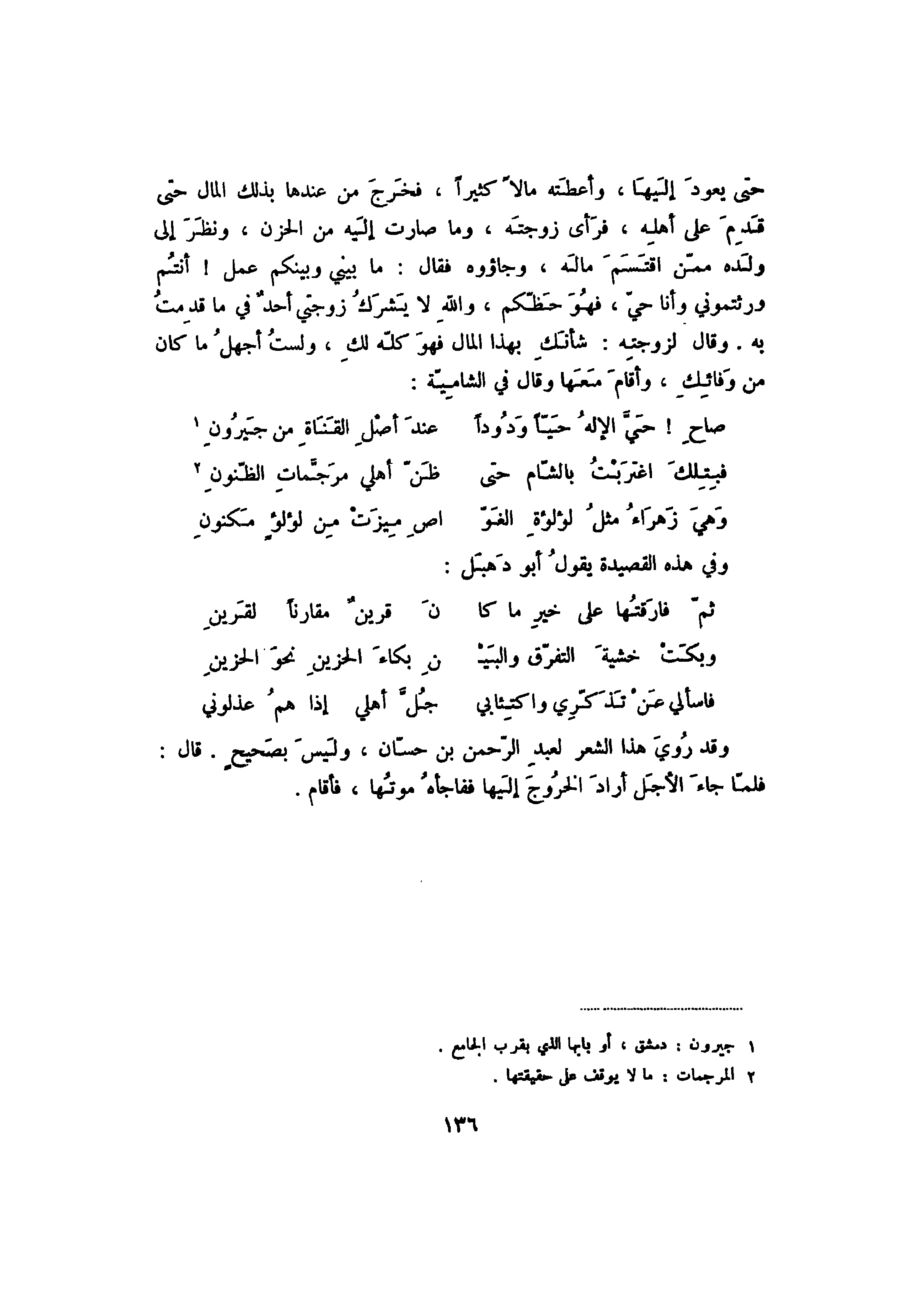 حتى يعود إليها، وأعطته مالاً كثيراً، فخرج من عندها بذلك المال حتى قدم على أهله، فرأى زوجته وما صارت إليه من الحزن، ونظر إلى ولده ممن اقتسم ماله، وجاؤوه فقال: ما بيني وبينكم عمل! أنتم ورثتموني وأنا حي، فهو حظكم، والله لا يشرك زوجتي أحد في ما قدمت به. وقال لزوجته: شأنك بهذا المال فهو كله لك، ولست أجهل ما كان من وفائك، وأقام معها وقال في الشامية:
