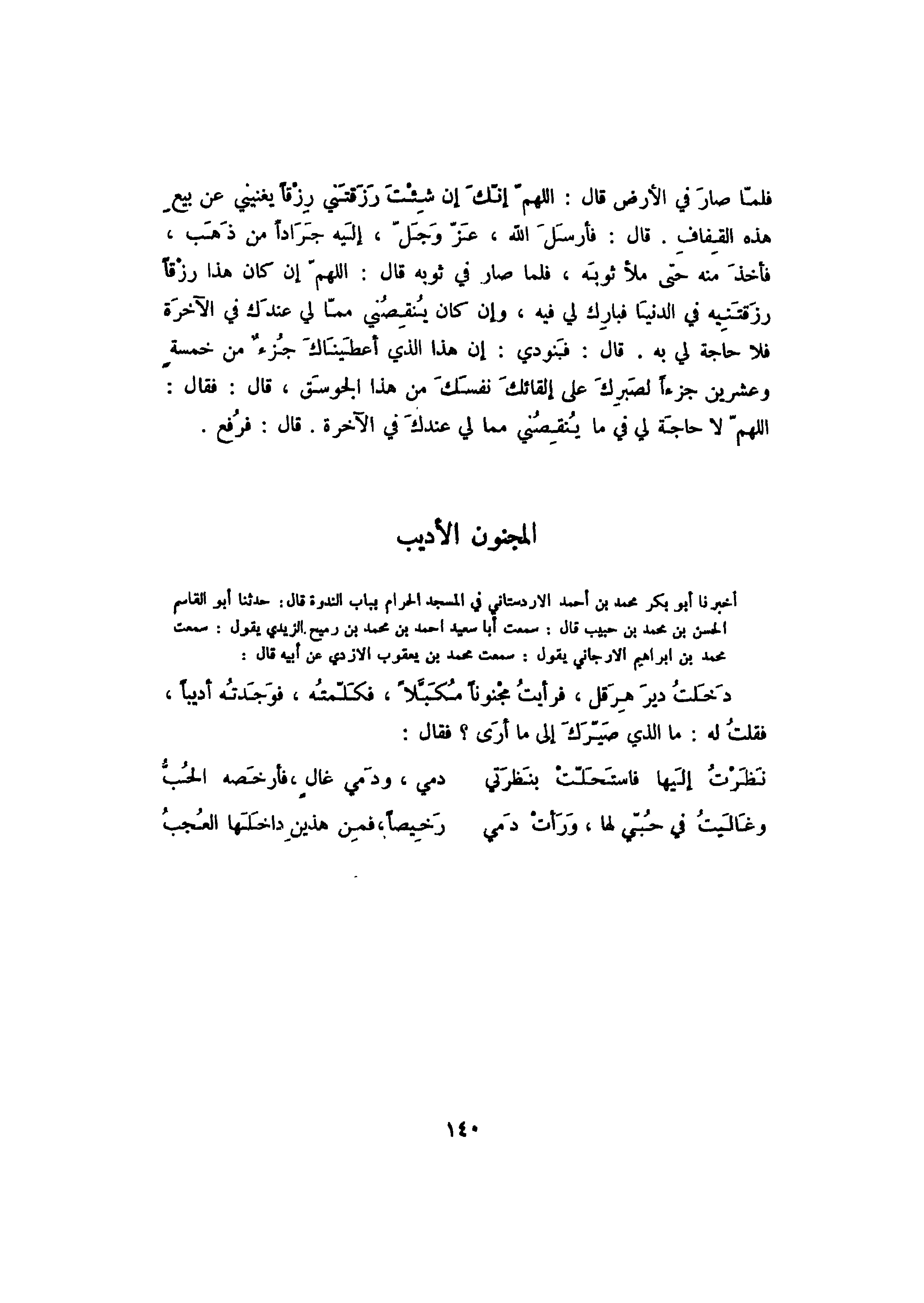 أخبرنا أبو بكر محمد بن أحمد الأردستاني في المسجد الحرام بباب الندوة قال: حدثنا أبو القاسم الحسن بن محمد بن حبيب قال: سمعت أبا سعيد أحمد بن رميح الزيدي يقول: سمعت محمد بن إبراهيم الأرجاني يقول: سمعت محمد بن يعقوب الأزدي عن أبيه قال: دخلت دير هرقل، فرأيت مجنوناً مكبلاً، فكلمته، فوجدته أديباً، فقلت له: ما الذي صيرك إلى ما أرى؟ فقال: