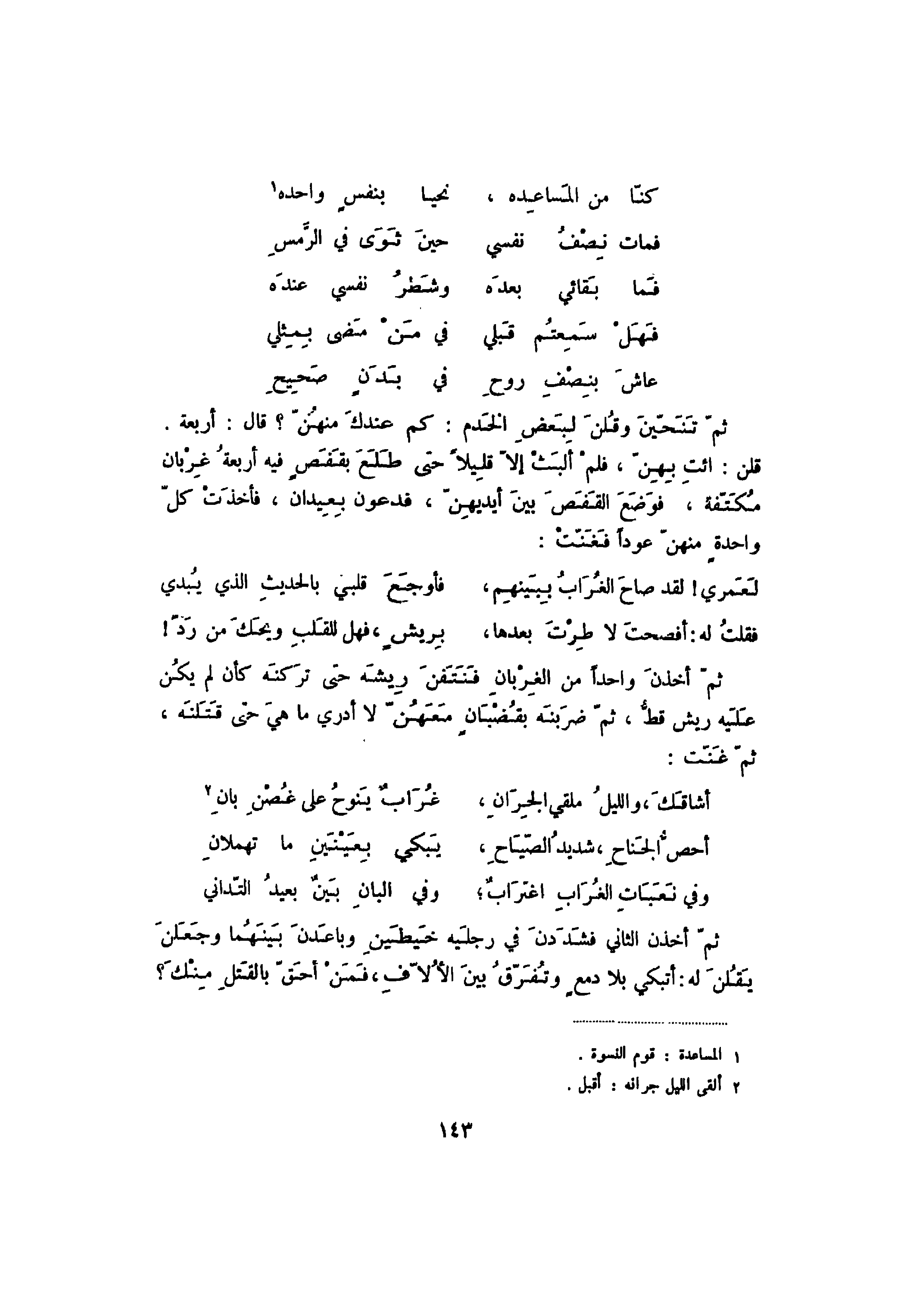 ثم تنحين وقلن لبعض الخدم: كم عندك منهن؟ قال: أربعة. قلن: ائت بهن، فلم ألبث إلا قليلاً حتى طلع بقفصٍ فيه أربعة غربان مكتفة، فوضع القفص بين أيديهن، فدعون بعيدان، فأخذت كل واحدة منهن عوداً فغنت: