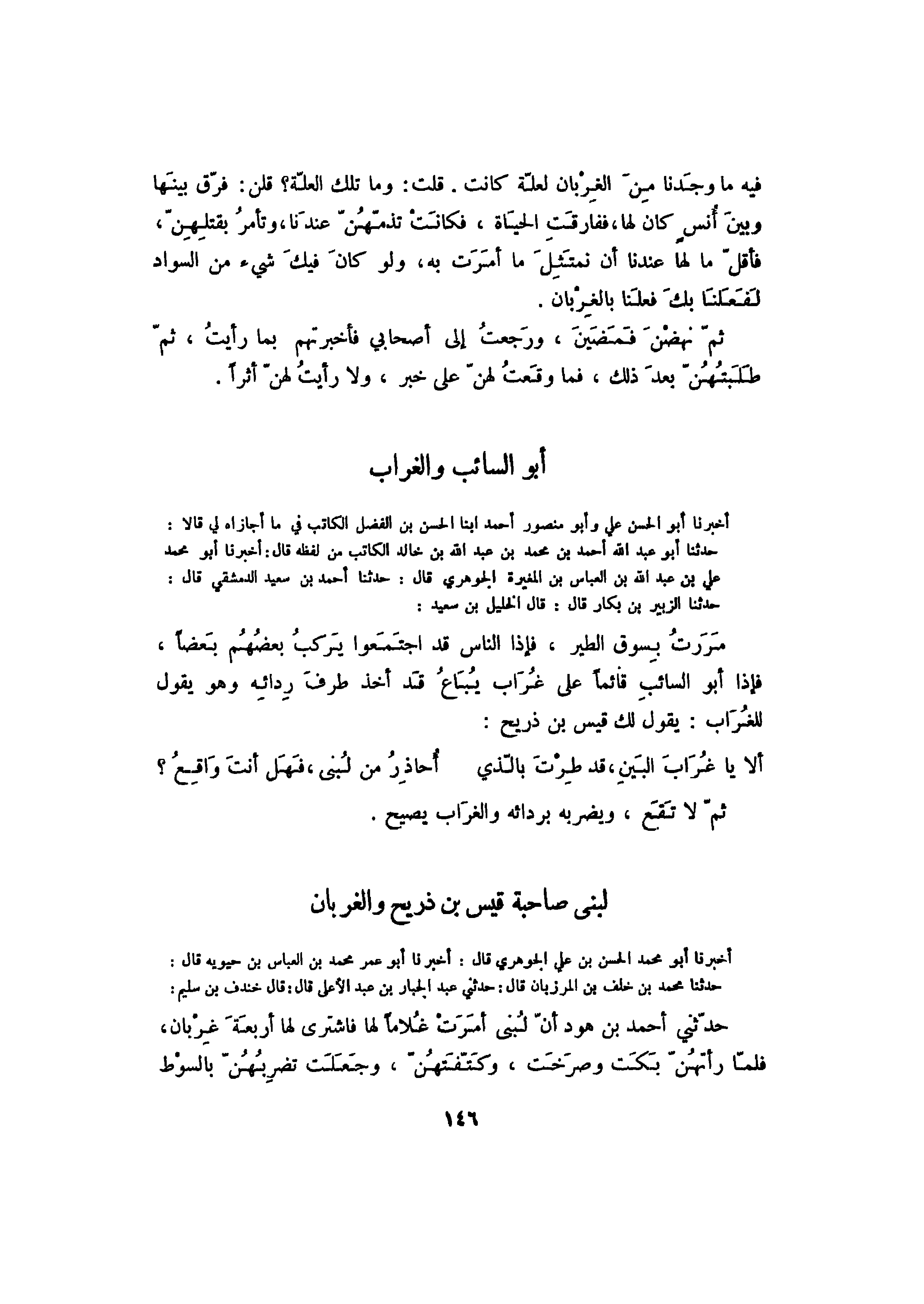 أخبرنا أبو الحسن علي وأبو منصور أحمد ابنا الحسن بن الفضل الكاتب في ما أجازاه لي قالا: حدثنا أبو عبد الله أحمد بن محمد بن عبد الله بن خالد الكاتب من لفظه قال: أخبرنا أبو محمد علي بن عبد الله بن العباس بن المغيرة الجوهري قال: حدثنا أحمد بن سعيد الدمشقي قال: حدثنا الزبير بن بكار قال: قال الخليل بن سعيد: مررت بسوق الطير، فإذا الناس قد اجتمعوا يركب بعضهم بعضاً، فإذا أبو السائب قائماً على غراب يباع قد أخذ طرف ردائه وهو يقول للغراب: يقول لك قيس بن ذريح: