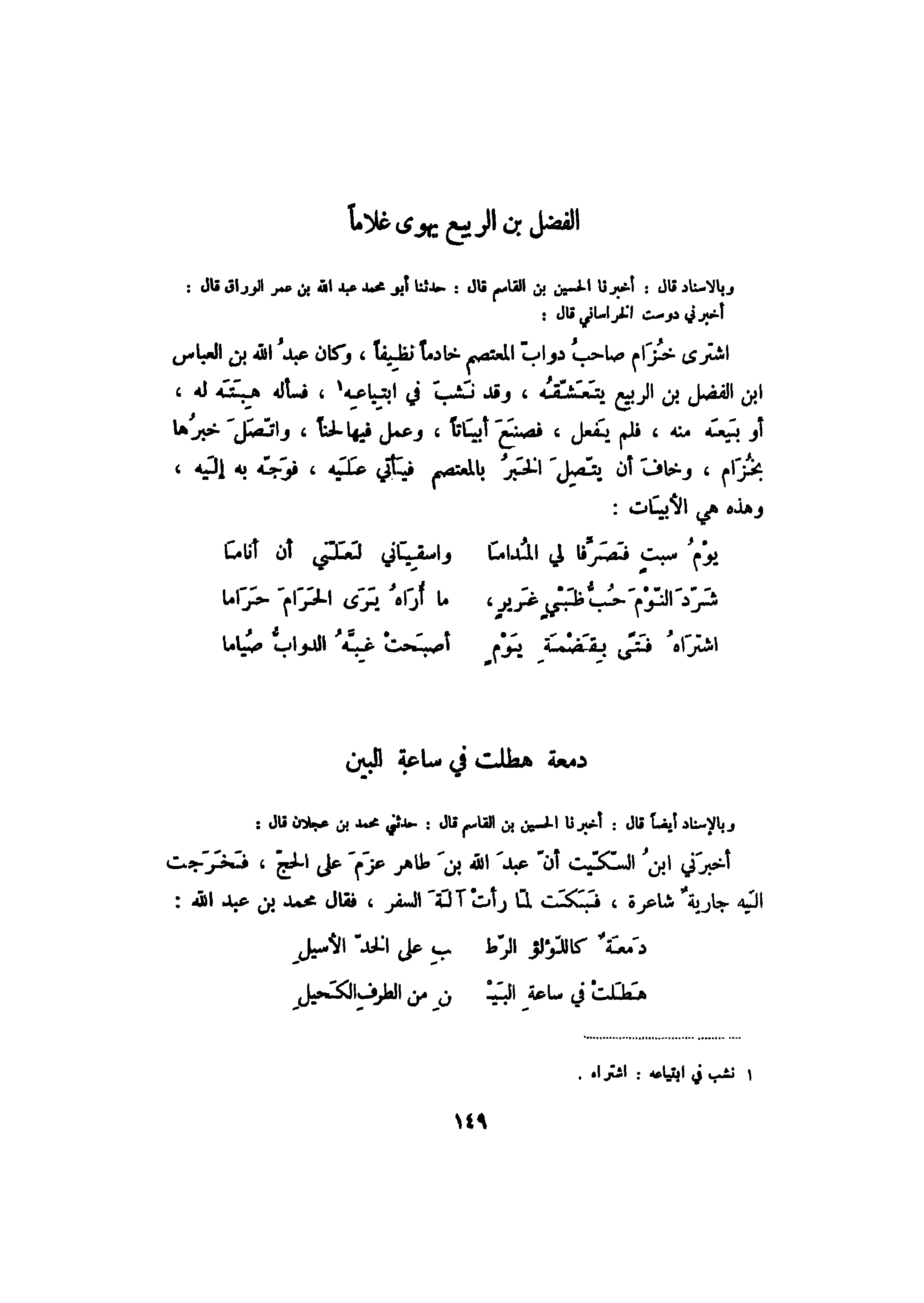 وبالإسناد قال: أخبرنا الحسين بن القاسم قال: حدثنا أبو محمد عبد الله بن عمر الوراق قال: أخبرني دوست الخراساني قال: اشترى خزام صاحب دواب المعتصم خادماً نظيفاً، وكان عبد الله بن العباس بن الفضل بن الربيع يتعشقه، وقد نشب في ابتياعه، فسأله هبته له، أو بيعه منه، فلم يفعل، فصنع أبياتاً، وعمل فيها لحناً، واتصل خبرها بخزام، وخاف أن يتصل الخبر بالمعتصم فيأتي عليه، فوجه به إليه، وهذه هي الأبيات: