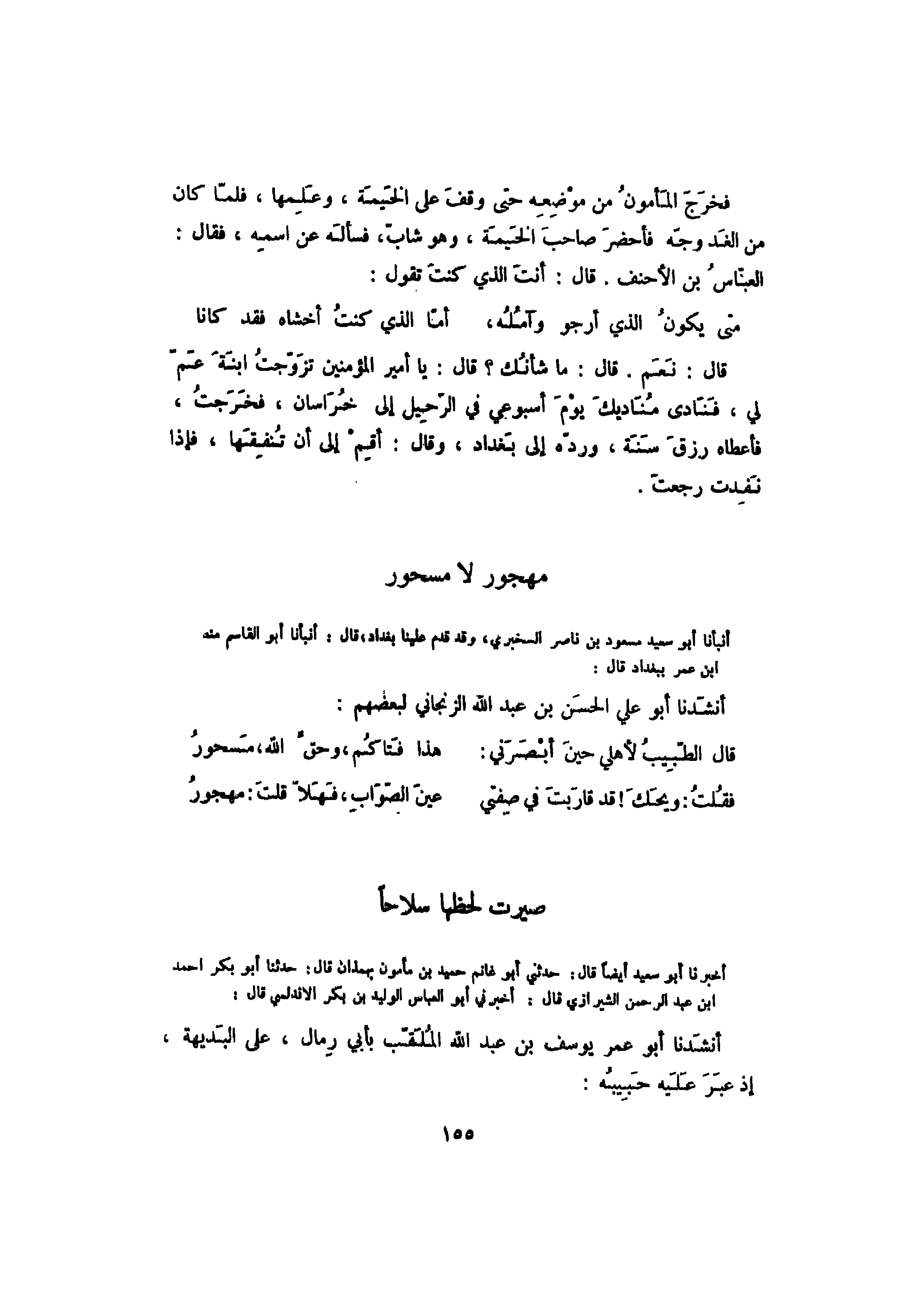 قال: نعم. قال: ما شأنك؟ قال: يا أمير المؤمنين تزوجت ابنة عم لي، فنادى مناديك يوم أسبوعي في الرحيل إلى خراسان، فخرجت، فأعطاه رزق سنة، ورده إلى بغداد، وقال: أقم إلى أن تنفقها، فإذا نفدت رجعت.