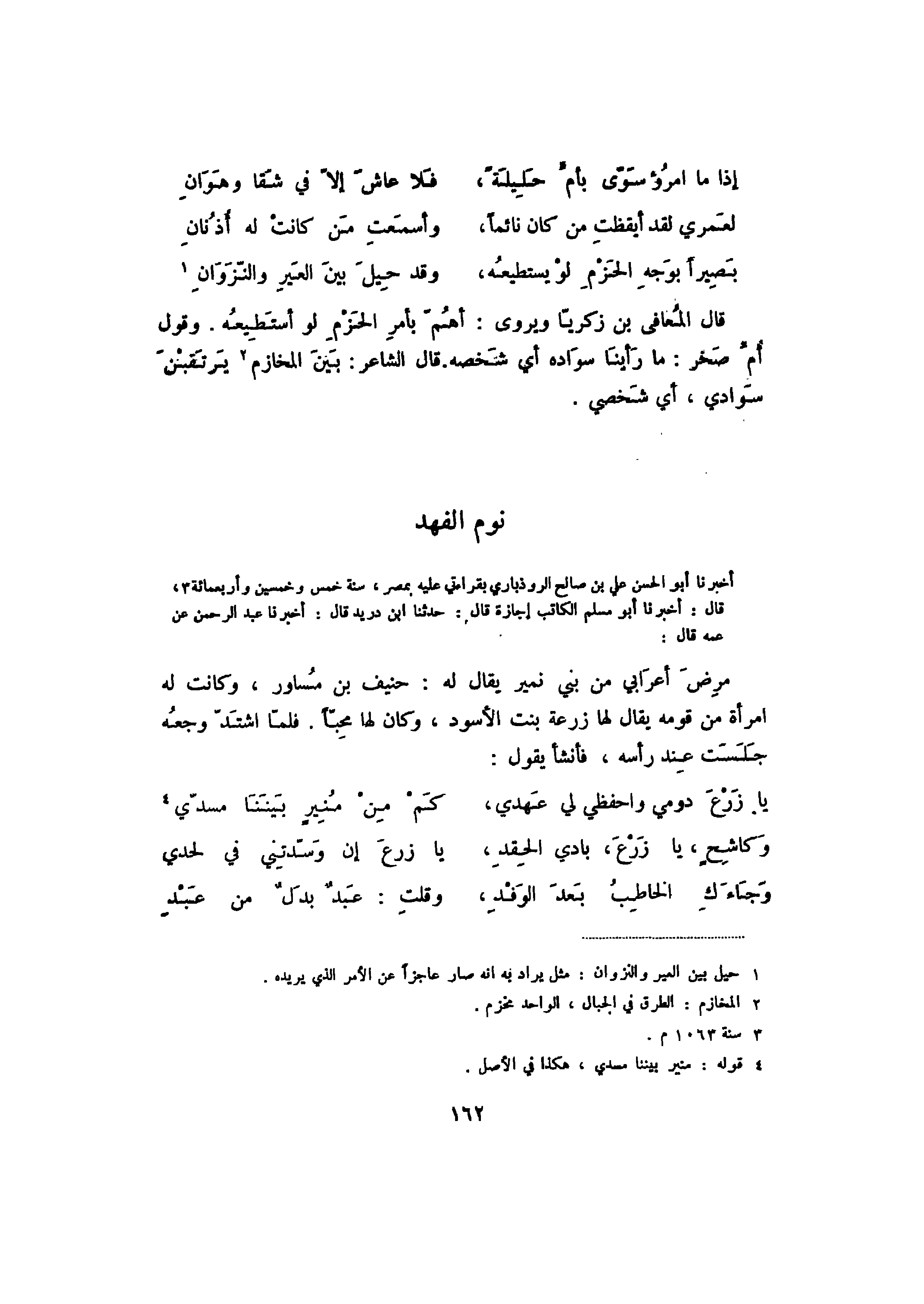 أخبرنا أبو الحسن علي بن صالح الروذباري بقراءتي عليه بمصر، سنة خمس وخمسين وأربعمائة، قال: أخبرنا أبو مسلم الكاتب إجازة قال: حدثنا ابن دريد قال: أخبرنا عبد الرحمن عن عمه قال: مرض أعرابي من بني نمير يقال له: حنيف بن مساور، وكانت له امرأة من قومه يقال لها زرعة بنت الأسود، وكان لها محباً. فلما اشتد وجعه جلست عند رأسه، فأنشأ يقول: