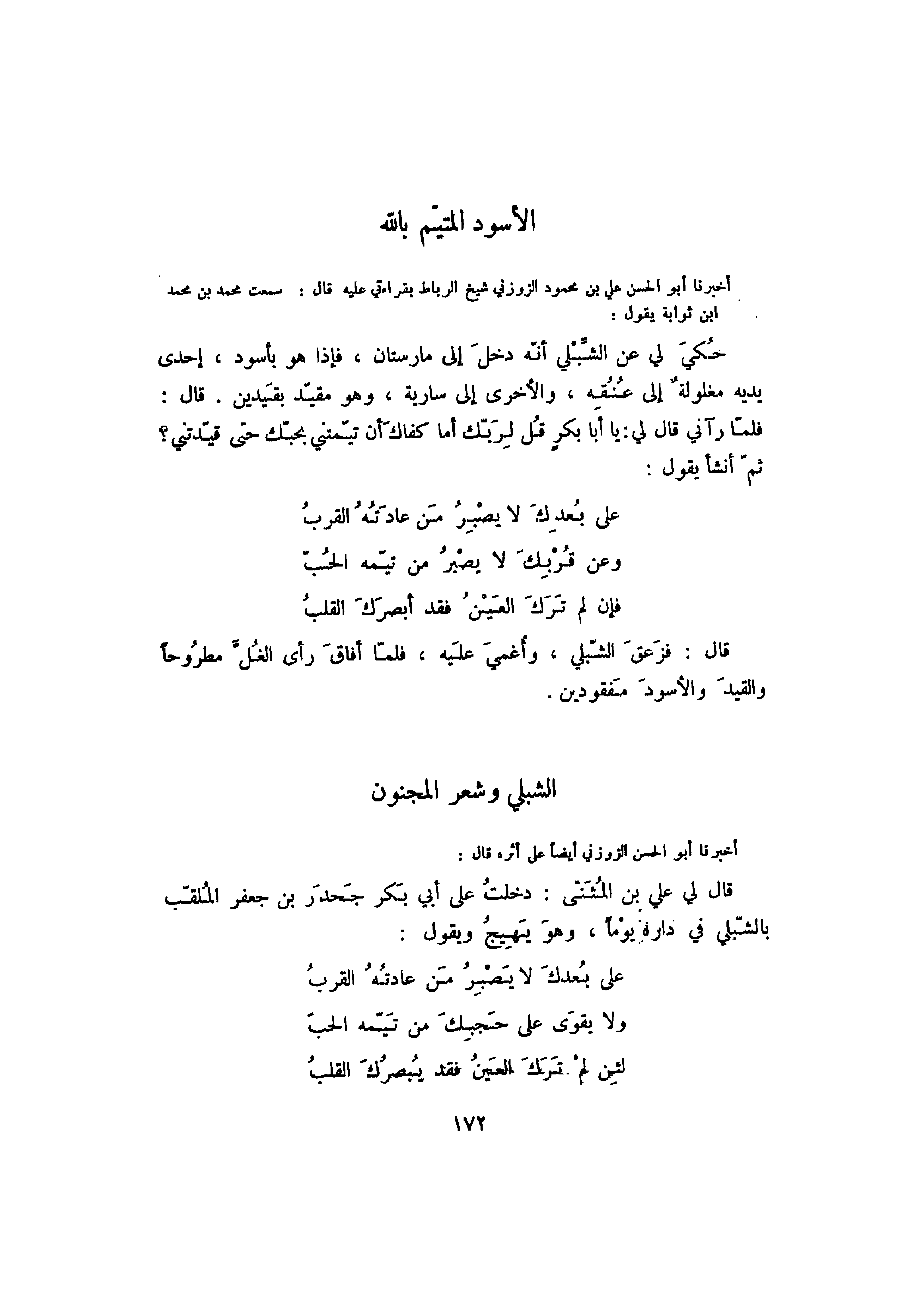 أخبرنا أبو الحسن علي ن محمود الزوزني شيخ الرباط بقراءتي عليه قال: سمعت محمد بن محمد بت ثوابة يقول: حكي لي عن الشبلي أنه دخل إلى مارستان، فإذا هو بأسود، إحدى يديه مغلولة إلى عنقه، والأخرى إلى سارية، وهو مقيد بقيدين. قال: فلما رآني قال لي: يا أبا بكر قل لربك أما كفاك أن تيمني بحبك حتى قيدتني؟ ثم أنشأ يقول: