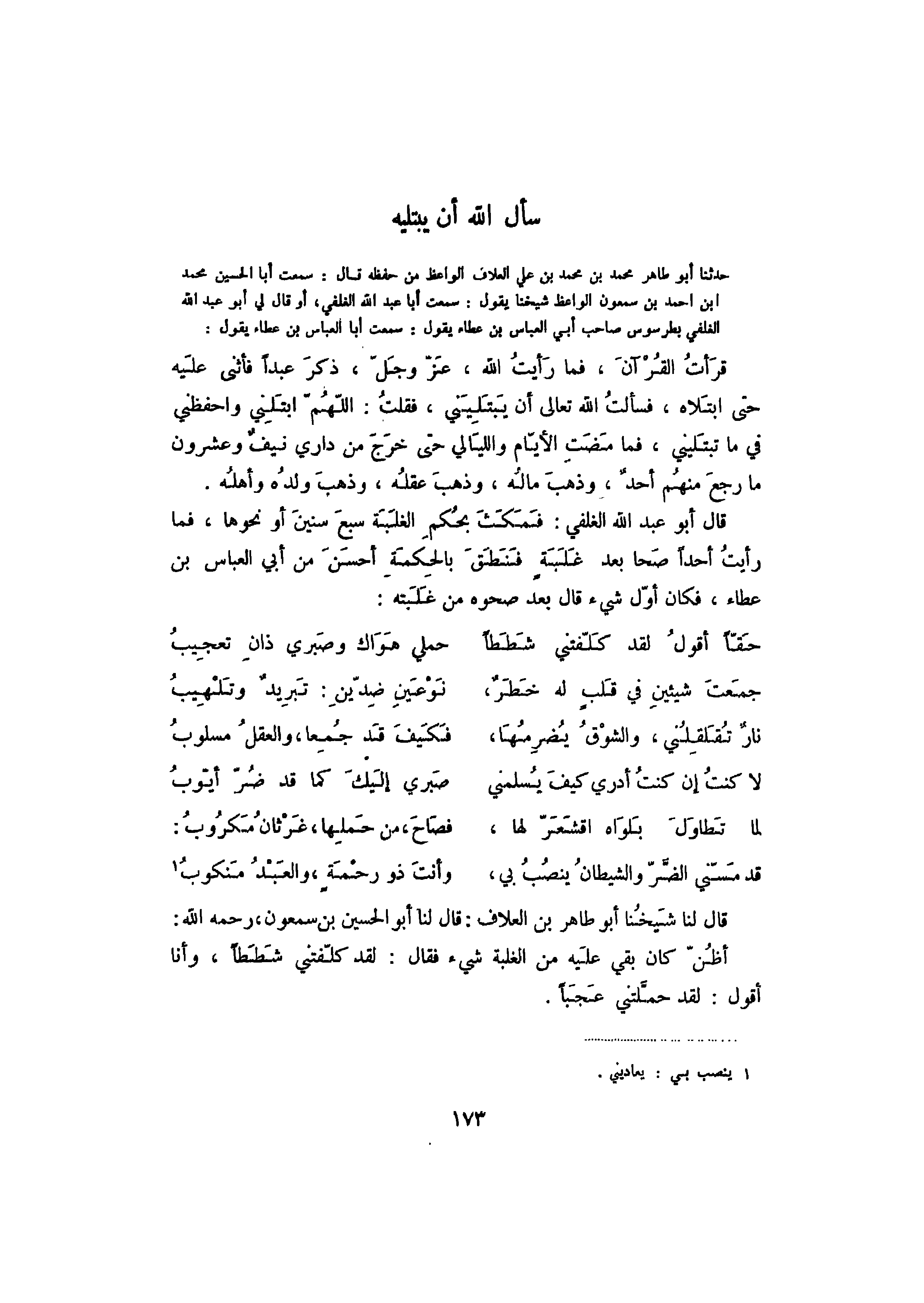 حدثنا أبو طاهر محمد بن محمد بن علي العلاف الواعظ من حفظه قال: سمعت أبا الحسين محمد بن أحمد بن سمعون الواعظ شيخنا يقول: سمعت أبا عبد الله الغلفي، أو قال لي أبو عبد الله الغلفي بطرسوس صاحب أبي العباس بن عطاء يقول: سمعت أبا العباس بن عطاء يقول: قرأت القرآن، فما رأيت الله، عز وجل، ذكر عبداً فأثنى عليه في ما تبتليني، فما مضت الأيام والليالي حتى خرج من داري نيف وعشرون ما رجع منهم أحد، وذهب ماله، وذهب عقله، وذهب ولده وأهله.