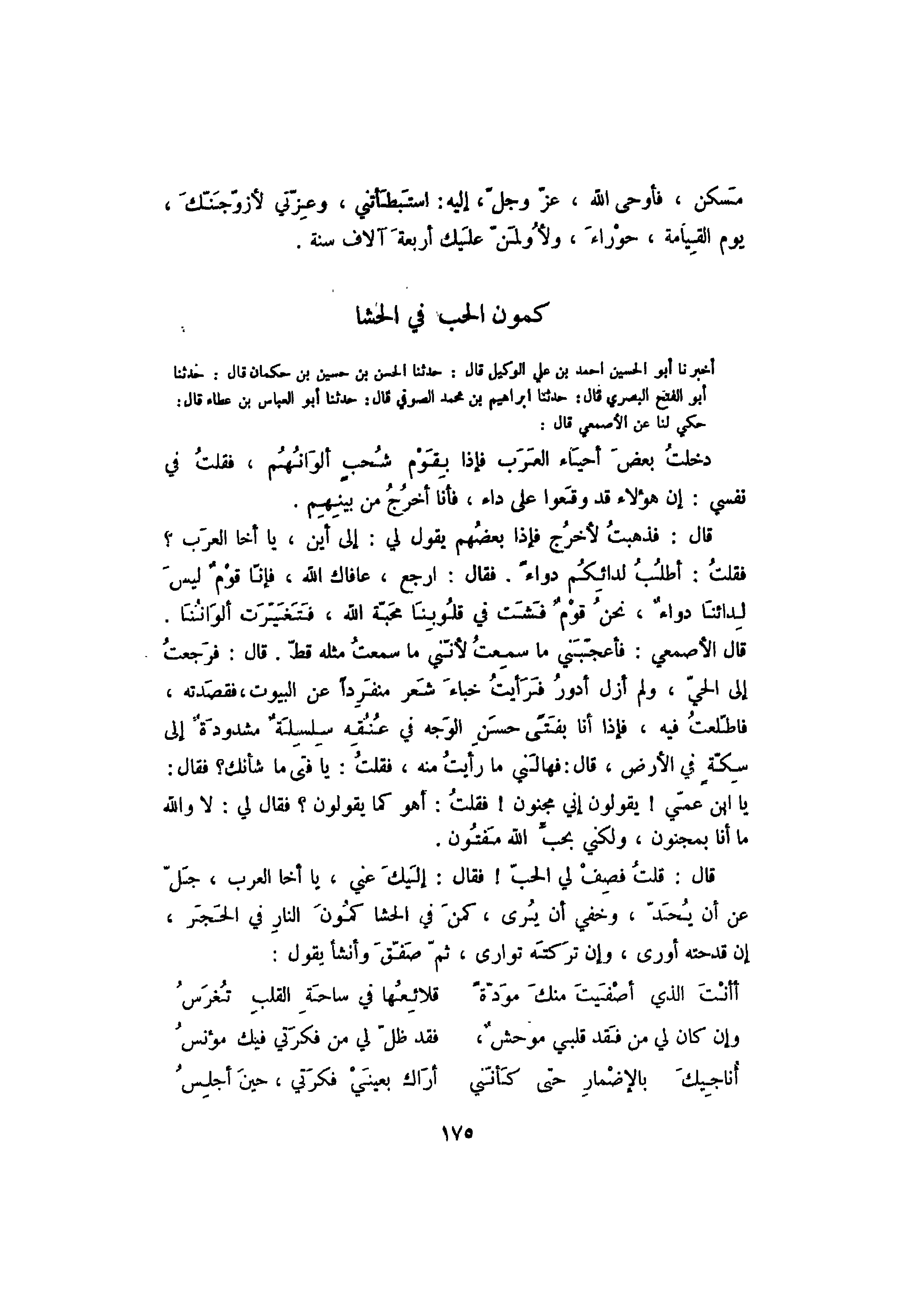 قال: فذهبت لأخرج فإذا بعضهم يقول لي: إلى أين، يا أخا العرب؟ فقلت: أطلب لدائكم دواءً. فقال: ارجع، عافاك الله، فإنا قوم ليس لدائنا دواء، نحن قوم فشت في قلوبنا محبة الله، فتغيرت ألواننا. قال الأصمعي: فأعجبيني ما سمعت لأنني ما سمعت مثله قط. قال: فرجعت إلى الحي، ولم أزل أور فرأيت خباء شعر منفرداً عن البيوت، فقصدته، فاطلعت فيه، فإذا أنا بفتىً حسن الوجه في عنقه سلسلة مشدودة سكة في الأرض، قال: فهالني ما رأيت منه، فقلت: يا فتى ما شأنك؟ فقال: يا ابن عمي! يقولون إني مجنون! فقلت: أهو كما يقولون؟ فقال لي: لا والله ما أنا بمجنون، ولكني بحب الله مفتون.