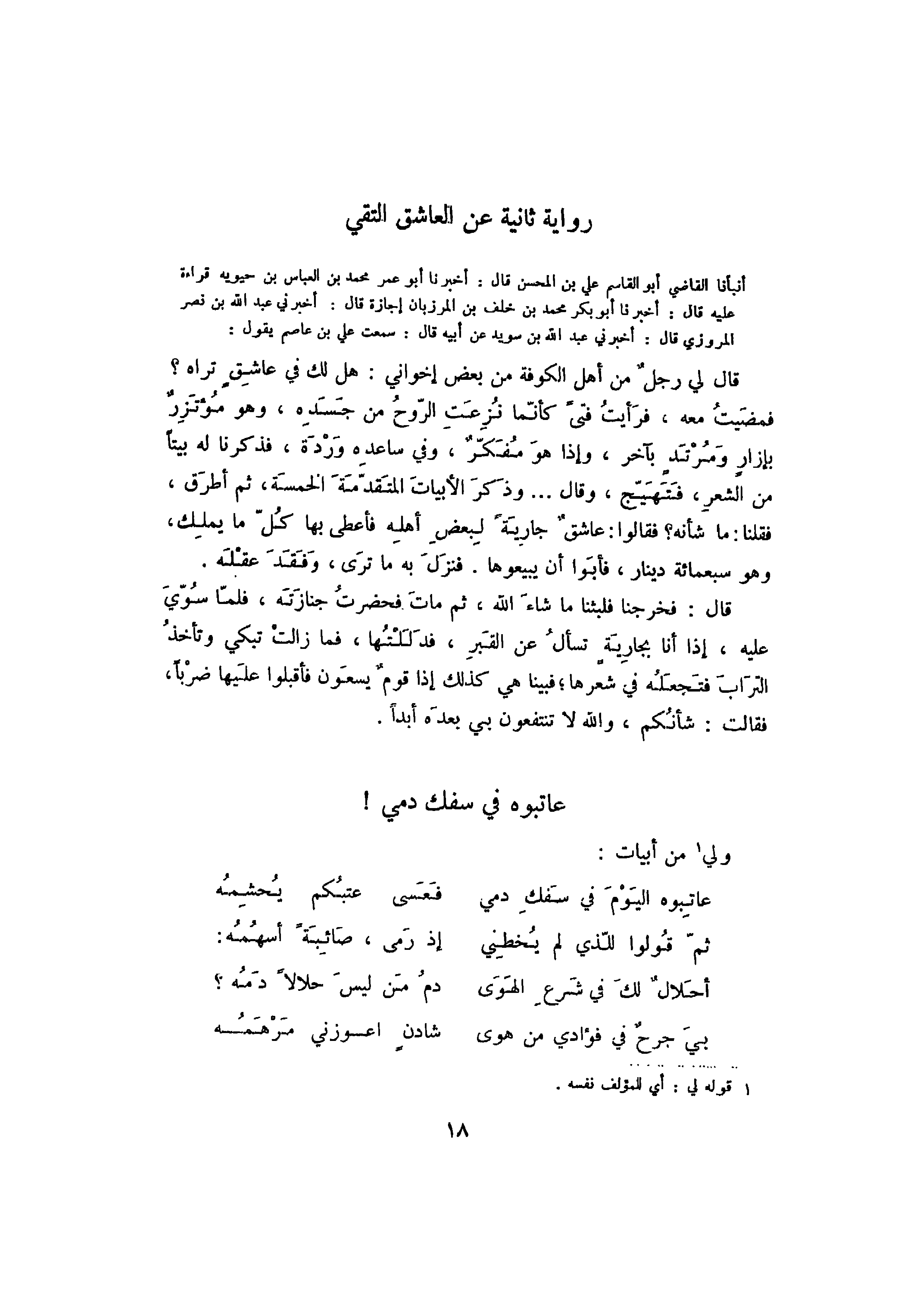 أنبأنا القاضي أبو القاسم علي بن المحسن قال: أخبرنا أبو عمر محمد بن العباس بن حيويه قراءة عليه قال: أخبرنا أبو بكر محمد بن خلف بن المرزبان إجازة قال: أخبرني عبد الله بن نصر المروزي قال: أخبرني عبد الله بن سويد عن أبيه قال: سمعت علي بن عاصم يقول: قال لي رجل من أهل الكوفة من بعض إخواني: هل لك في عاشقٍ تراه؟ فمضيت معه، فرأيت فتىً كأنما نزعت الروح من جسده، وهو مؤتزر بإزار ومرتد بآخر، وإذا هو مفكر، وفي ساعده وردة، فذكرنا له بيتاً من الشعر، فتهيج، وقال: وذكر الأبيات المتقدمة الخمسة، ثم أطرق، فقلنا: ما شأنه؟ فقالوا: عاشق جاريةً لبعض أهله فأعطى بها كل ما يملك، وهو سبعمائة دينار، فأبوا أن يبيعوها. فنزل به ما ترى، وفقد عقله.
