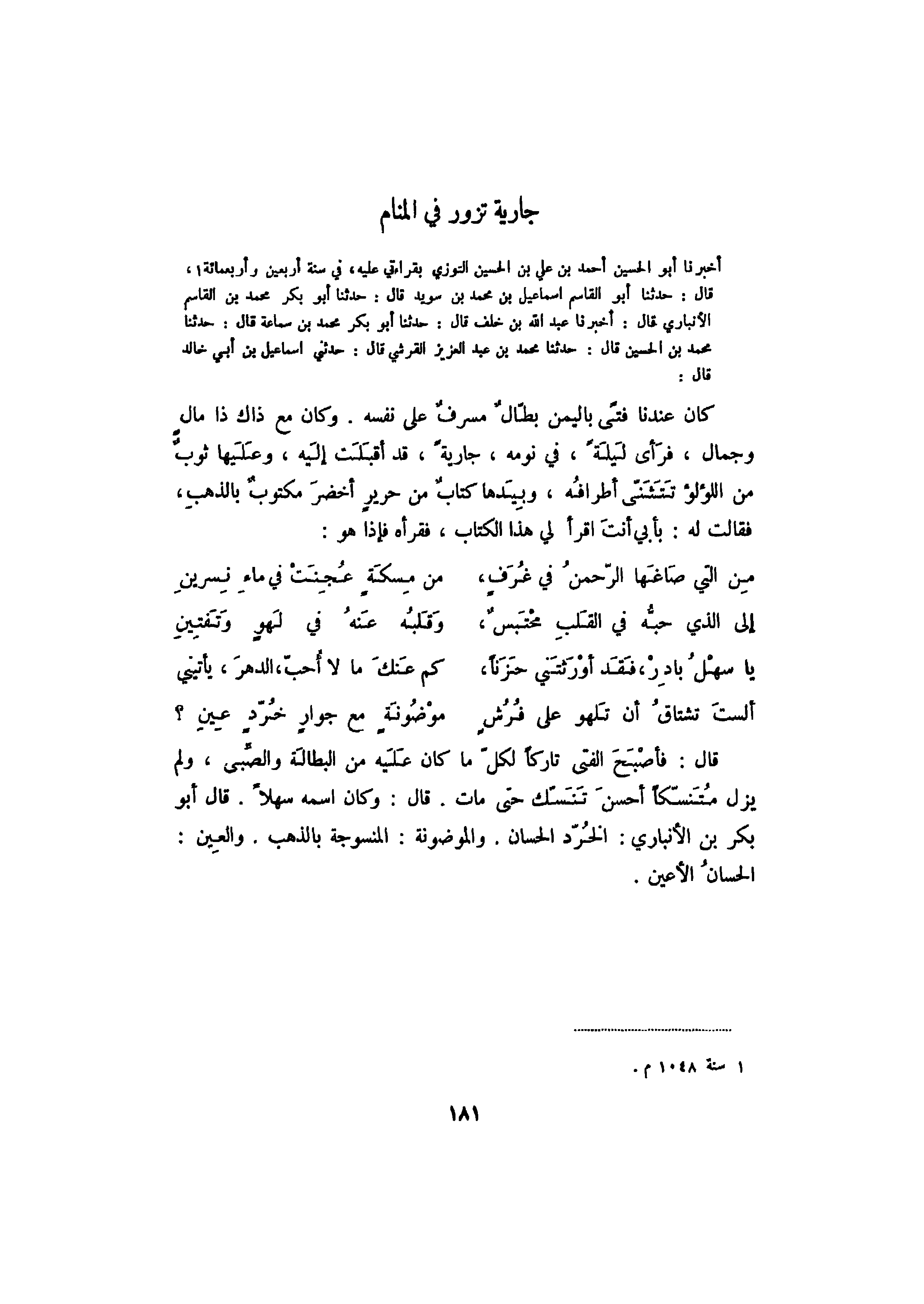 أخبرنا أبو الحسن أحمد بن علي بن الحسين التوزي بقراءتي عليه، في سنة أربعين وأربعمائة، قال: حدثنا أبو القاسم إسماعيل بن محمد بن سويد قال: حدثنا أبو بكر محمد بن القاسم الأنباري قال: أخبرنا عبد الله بن خلف قال: حدثنا أبو بكر محمد بن سماعة قال: حدثنا محمد بن الحسين قال: حدثنا محمد بن عبد العزيز القرشي قال: حدثني إسماعيل بن أبي خالد قال: كان عندنا فتىً باليمن بطال مسرف على نفسه. وكان مع ذلك ذا مال وجمال، فرأى ليلةً، في نومه، جاريةً، قد أقبلت إليهن وعليها ثوب من اللؤلؤ تتثنى أطرافه، وبيدها كتاب من حرير أخضر مكتوب بالذهب، فقالت له: بأبي أنت اقرأ لي هذا الكتاب، فقرأه فإذا هو: