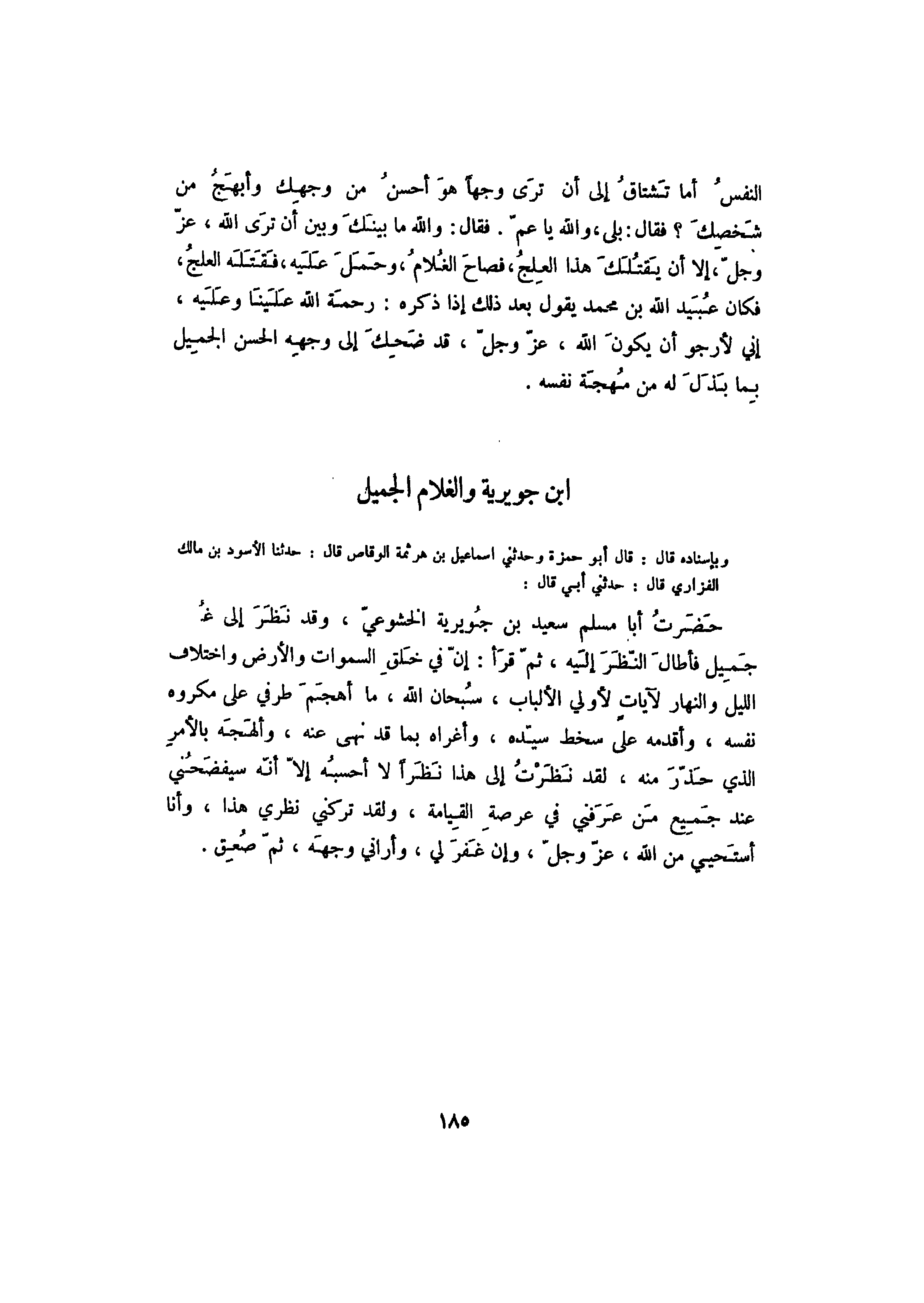 النفس أنا تشتاق إلى أن ترى وجهاً هو أحسن من وجهك وأبهج من شخصك؟ فقال: بلى، والله يا عم. فقال: والله ما بينك وبين أن ترى الله، عز وجل، إلا أن يقتلك هذا العلج، فصاح الغلام، وحمل عليه، فقتله العلاج، فكان عبيد الله بن محمد يقول بعد ذلك إذا ذكره: رحمة الله علينا وعليه، إني لأرجو أن يكون الله، عز وجل، قد ضحك غلى وجهه الحسن الجميل بما بذل له من مهجة نفسه.
