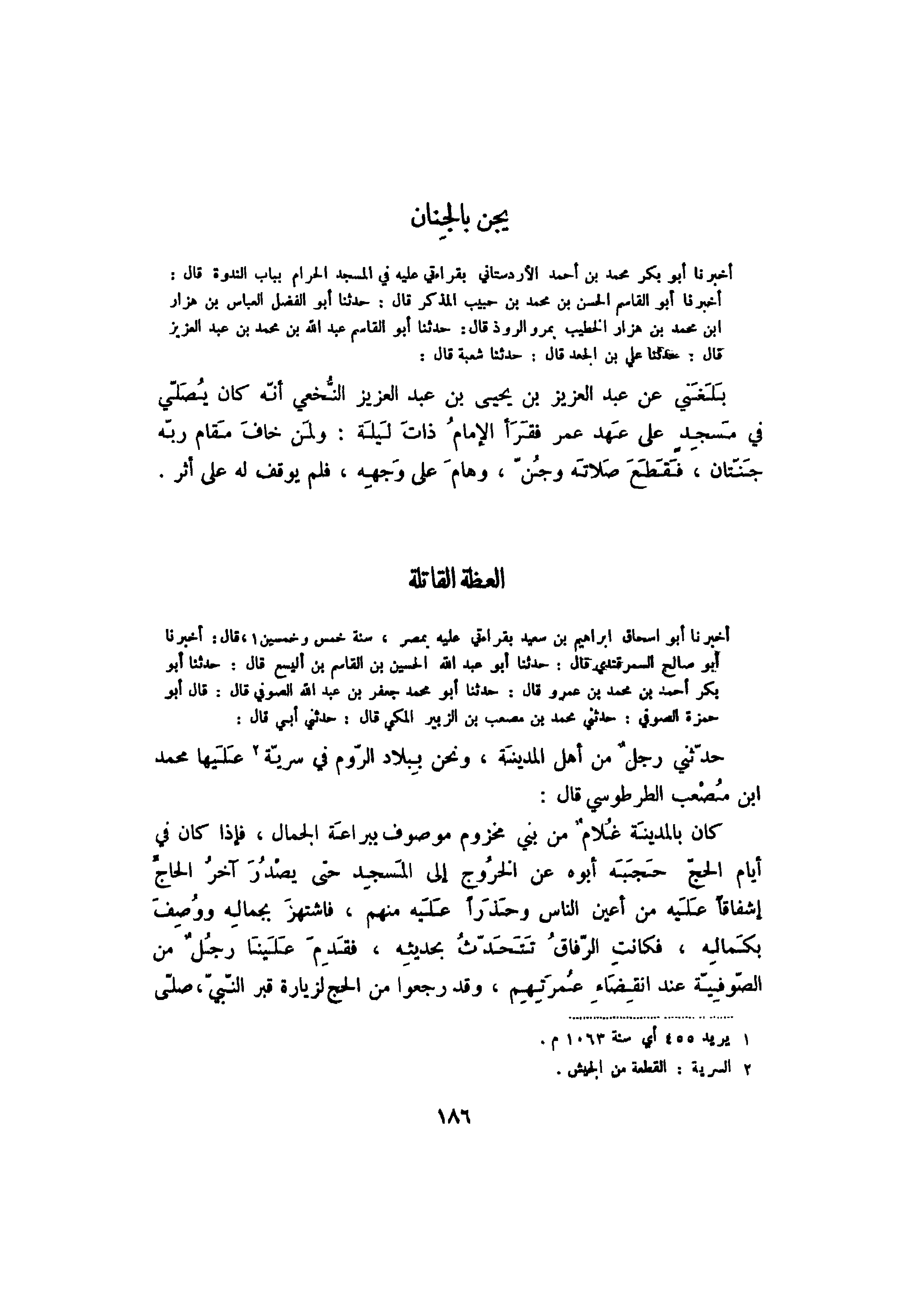أخبرنا أبو إسحاق إبراهيم بن سعيد بقراءتي عليه بمصر، سنة خمس وخمسين، قال: أخبرنا أبو صالح السمرقندي قال: حدثنا أبو عبد الله الحسين بن القاسم بن أليسع قال: حدثنا أبو بكر أحمد بن محمد بن عمرو قال: حدثنا أبو محمد جعفر بن عبد الله الصوفي قال: أبو حمزة الصوفي: حدثني محمد بن مصعب بن الزبير المكي قال: حدثني أبي قال: حدثني رجل من أهل المدينة، ونحن ببلاد الروم في سرية عليها محمد بن مصعب الطرطوسي قال: كان بالمدينة غلام من بني مخزوم موصوف ببراعة الجمال، فإذا كان في أيام الحج حجبه أبوه عن الخروج إلى المسجد حتى يصدر آخر الحاج إشفاقاً عليه من أعين الناس وحذراً عليه منهم، فاشتهر بجماله ووصف بكماله، فكانت الرفاق تتحدث بحديثه، فقدم علينا رجل من الصوفية عند انقضاء عمرتهم، وقد رجعوا من الحج لزيارة قبر النبي، صلى