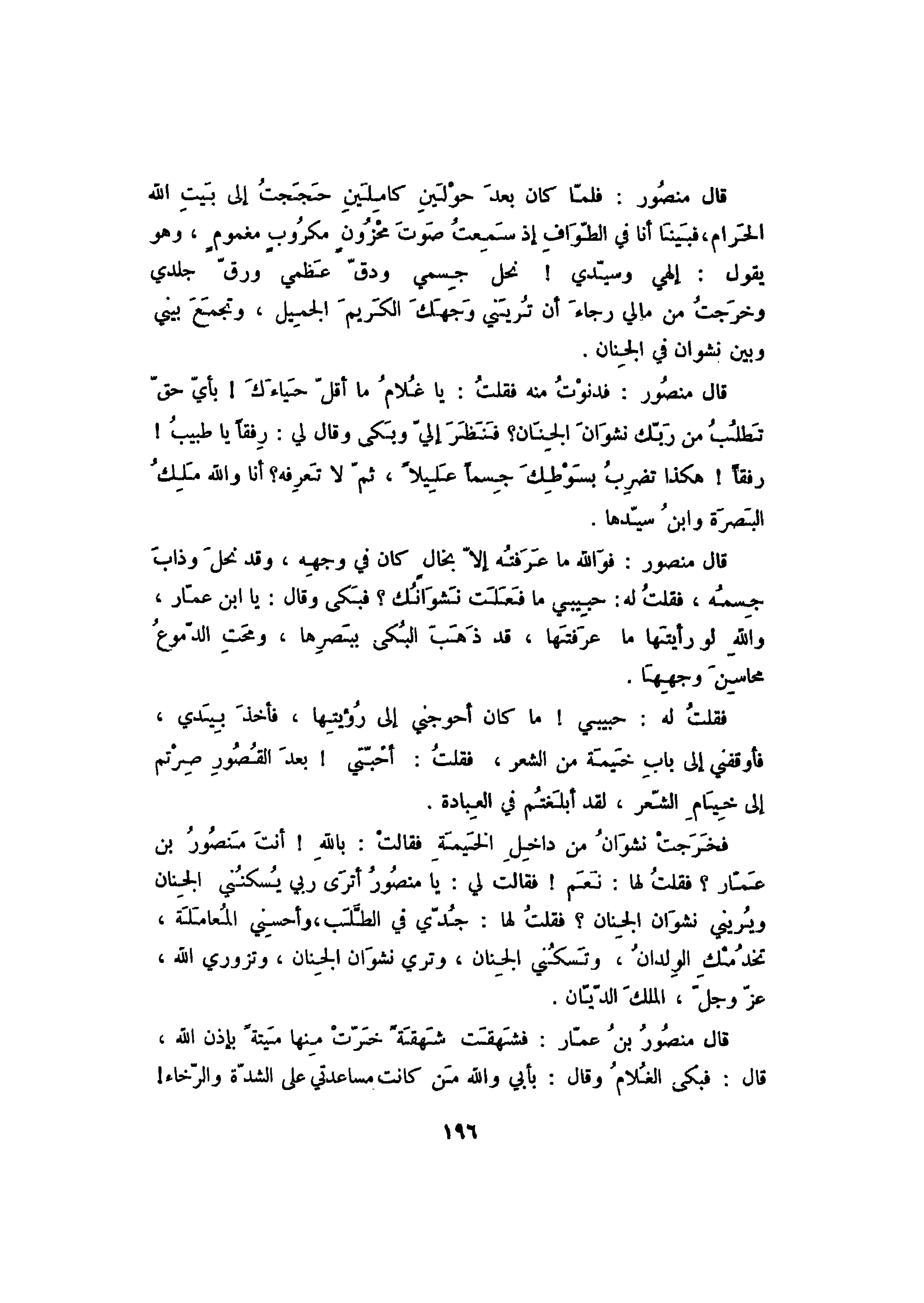 فخرجت نشوان من داخل الخيمة فقالت: بالله! أنت منصور بن عمار؟ فقلت لها: نعم! فقالت لي: يا منصور أترى ربي يسكنني الجنان ويريني نشوان الجنان؟ فقلت لها: جدي في الطلب، وأحسني المعاملة، تخدمك الولدان، وتسكنني الجان، وتري نشوان الجنان، وتزوري الله، عز وجل، الملك الديان.