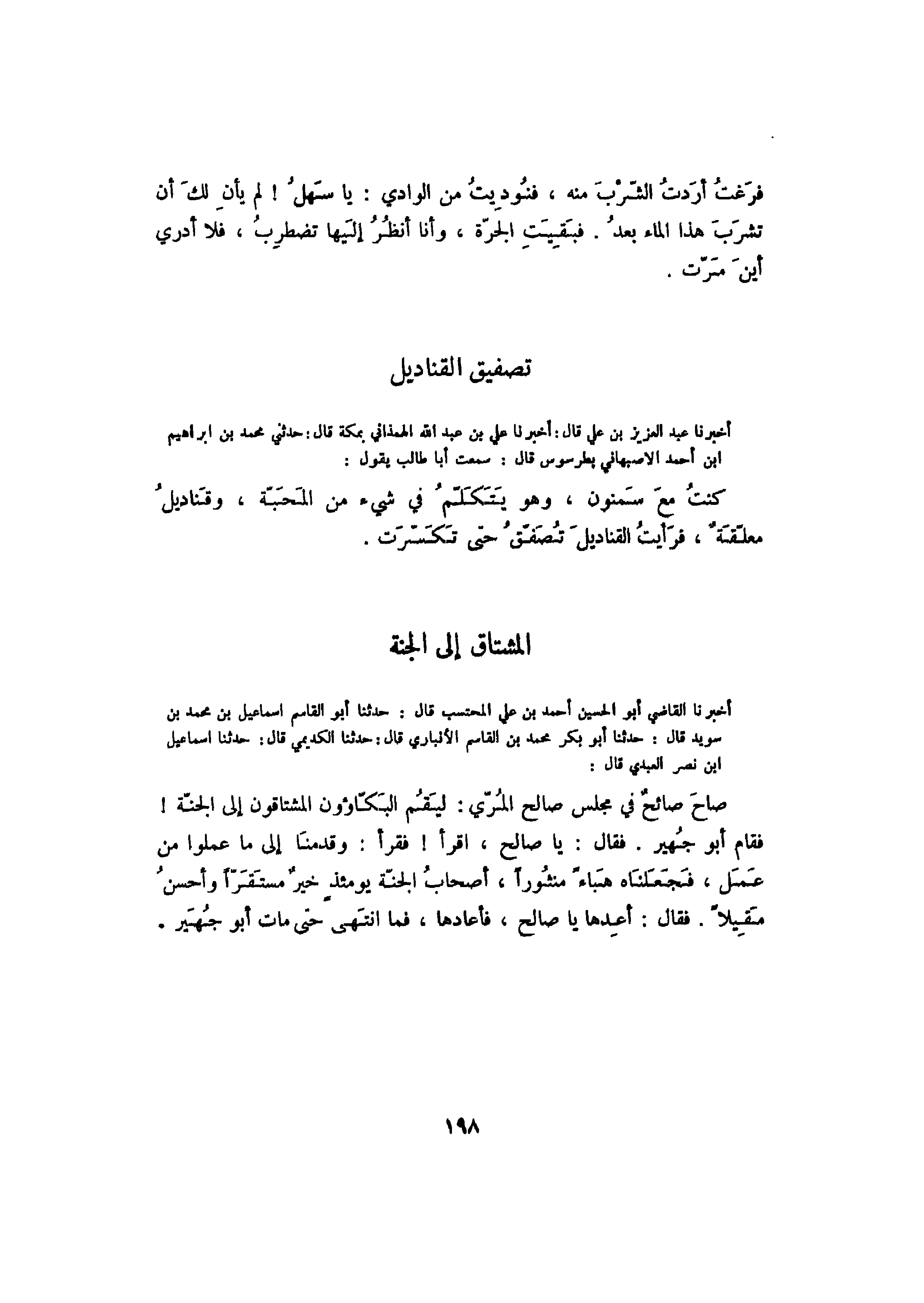 فرغت أردت الشرب منه، فنوديت من الوادي: يا سهل! لم يأن لك أن تشرب هذا الماء بعد. فبقيت الجرة، وأنا أنظر إليها تضطرب، فلا أدري أين مرت.